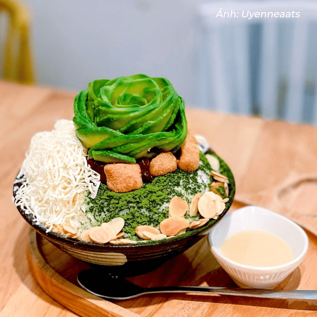 Thực đơn quán đa dạng gồm các loại bingsu kết hợp trái cây thanh mát, trang trí cầu kỳ, cho tín đồ ẩm thực thỏa sức check-in. Bingsu bơ trà xanh, bingsu sợi phô mai là hai món đáng thử khi đến đây. Trà xanh ở quán có vị hơi đắng, nhưng bạn thêm ít sữa và kem tươi, món ăn sẽ trở nên tròn vị và hấp dẫn hơn.