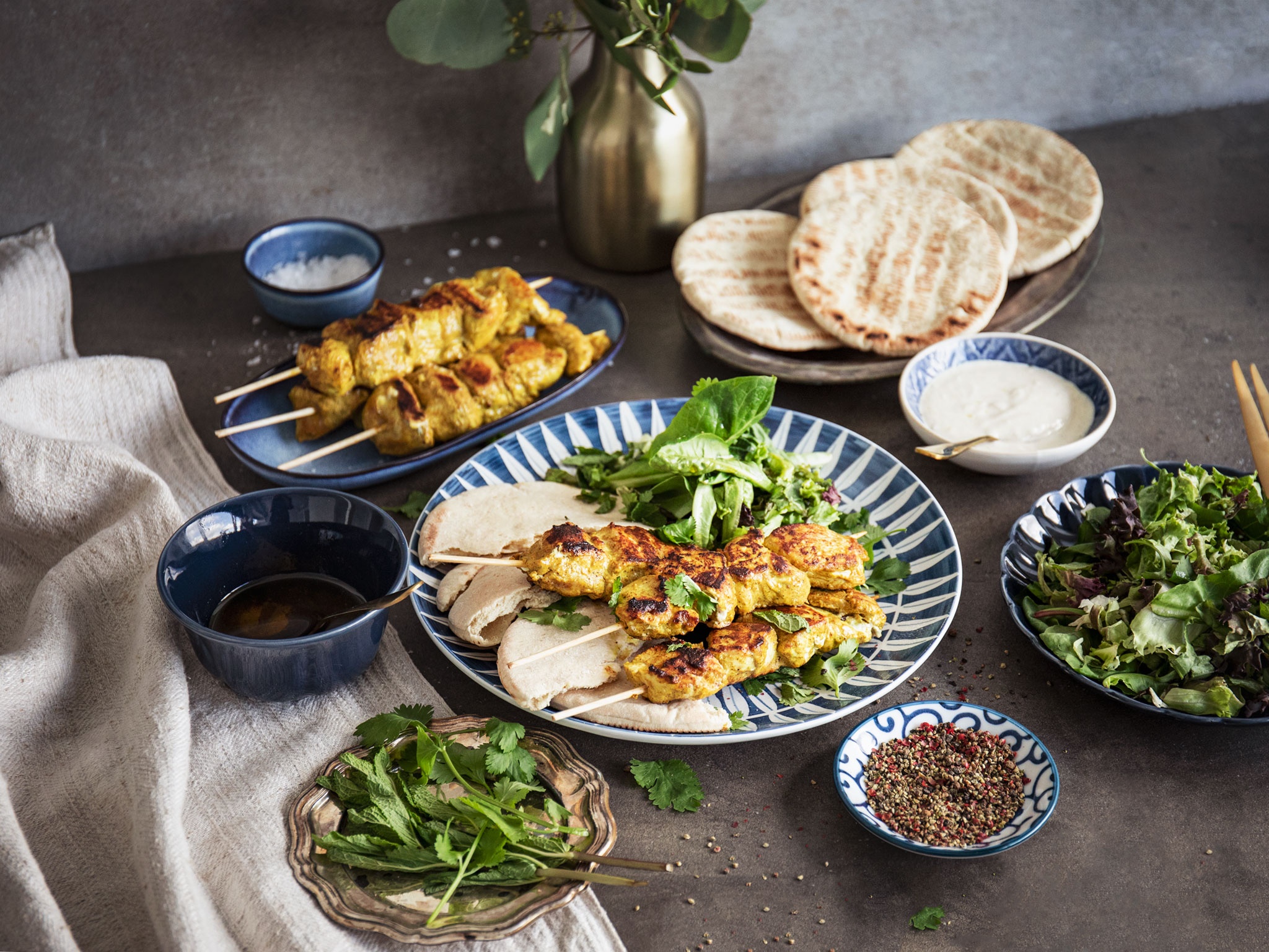 - Phục vụ xiên gà kèm bánh mì pita, salad, sốt, ngò tươi, rau bạc hà và nhúng sữa chua.