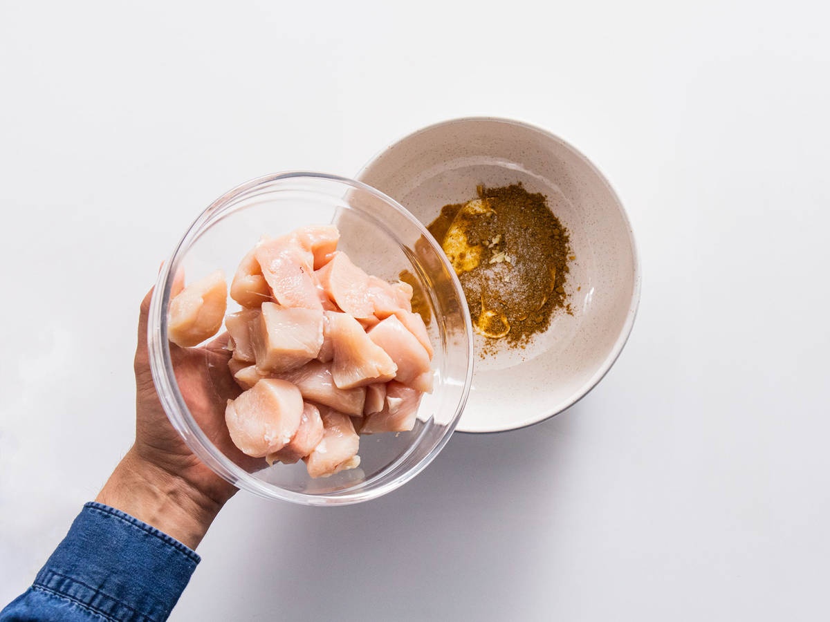 - Thêm ức gà vào, nêm chút muối, rồi xóc đều và ướp 30 phút cho ngấm gia vị.