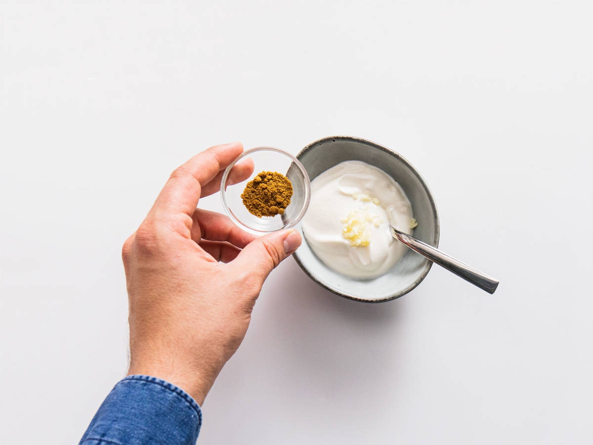 - Cho một nửa số sữa chua, gia vị ras el hanout, một nửa tỏi băm nhỏ, ít nước cốt chanh vào bát và khuấy đều.