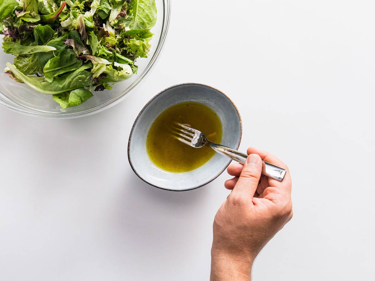 - Để làm nước trộn salad, cho nước cốt chanh còn lại và dầu olive vào tô, nêm muối, tiêu và đường cho vừa ăn.