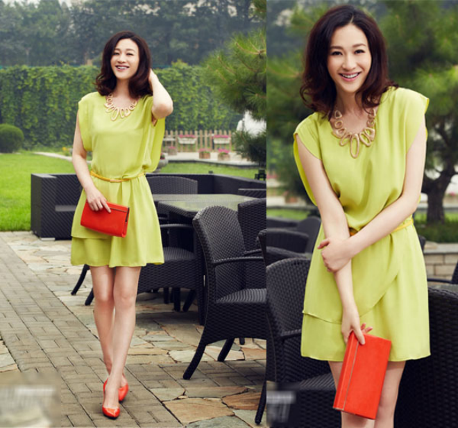 | Bạn gái có thể chọn chiếc váy nhẹ nhàng màu xanh cốm này. Dù là váy đơn sắc nhưng sẽ không đơn điệu nếu váy được mix thêm thắt lưng tạo điểm nhận ở eo hay thêm chiếc xách chữ nhật màu đỏ. |