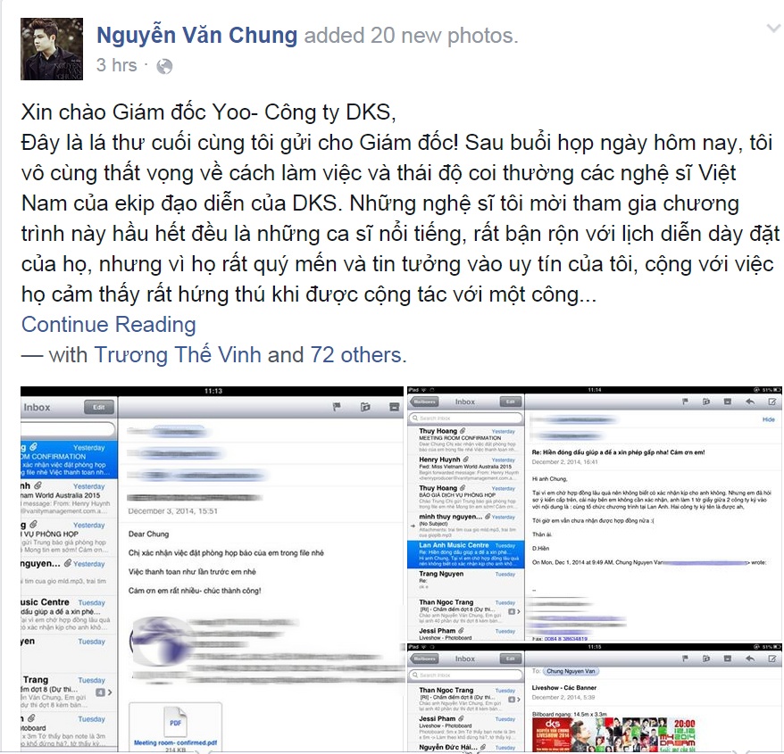 Trên trang cá nhân, nhạc sĩ Nguyễn Văn Chung bày tỏ sự bức xúc với DKS - công ty tổ chức sự kiện lớn của Hàn Quốc - vì cách làm việc thiếu chuyên nghiệp khi chọn anh là nhạc sĩ đầu tiên của Việt Nam để kết hợp thực hiện một liveshow dự kiến diễn ra vào tối ngày 12/12 tại TP.HCM.