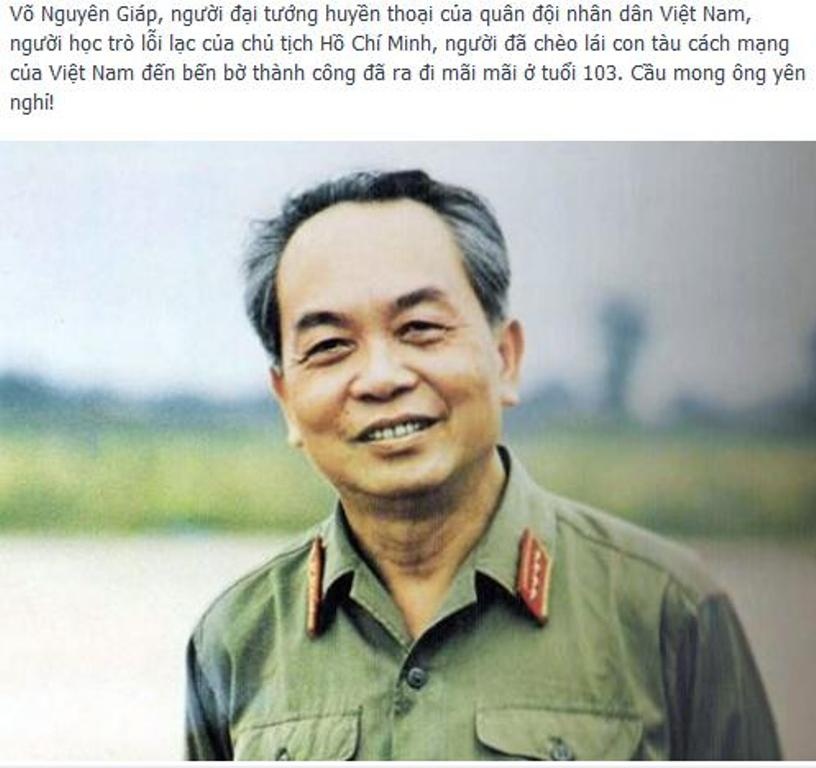 | Thành viên John Nguyễn viết: "Võ Nguyên Giáp, người Đại tướng huyền thoại của Quân đội Nhân dân Việt Nam, người học trò lỗi lạc của chủ tịch Hồ Chí Minh, người đã chèo lái con tàu cách mạng của Việt Nam đến bến bờ thành công đã ra đi mãi mãi ở tuổi 103. Cầu mong ông yên nghỉ". |