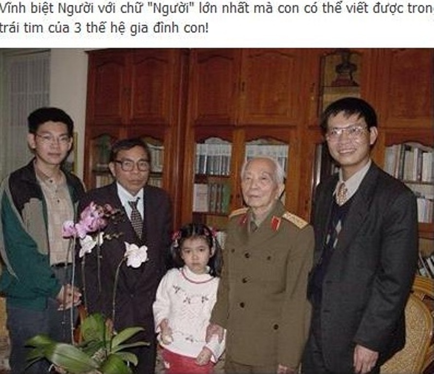 | TS Lương Hoài Nam đăng tải bức ảnh Đại tướng Võ Nguyên Giáp chụp cùng gia đình. Ông viết: “Vĩnh biệt Người với chữ "Người" lớn nhất mà con có thể viết được trong trái tim của 3 thế hệ gia đình con”. |