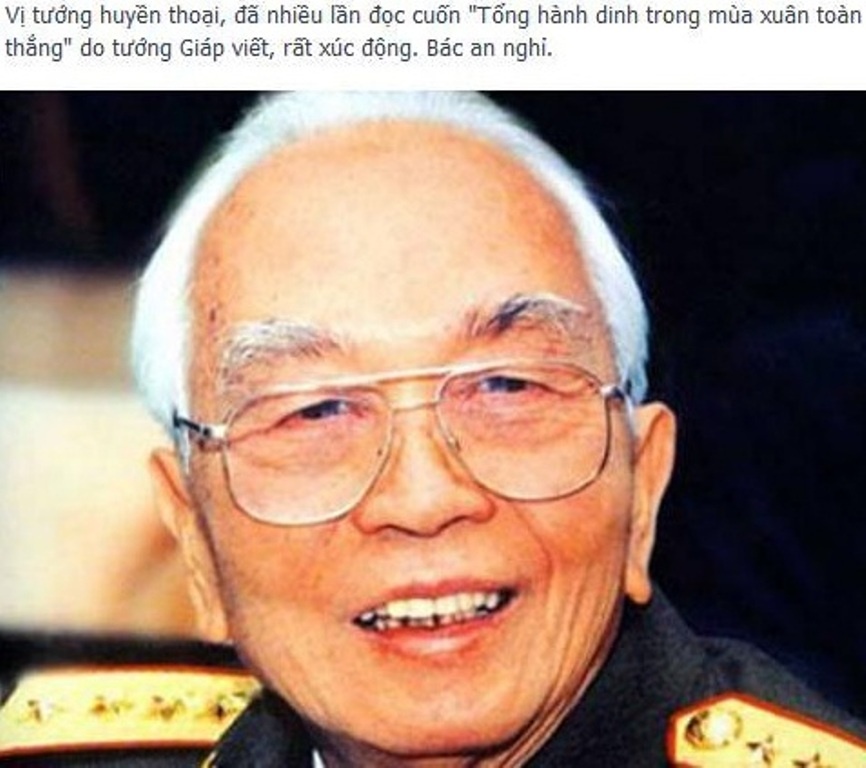 | Thành viên Trung Do chia sẻ: "Vị tướng huyền thoại, đã nhiều lần đọc cuốn: "Tổng hành dinh trong mùa xuân toàn thắng" do tướng Giáp viết, rất xúc động. Bác an nghỉ". |