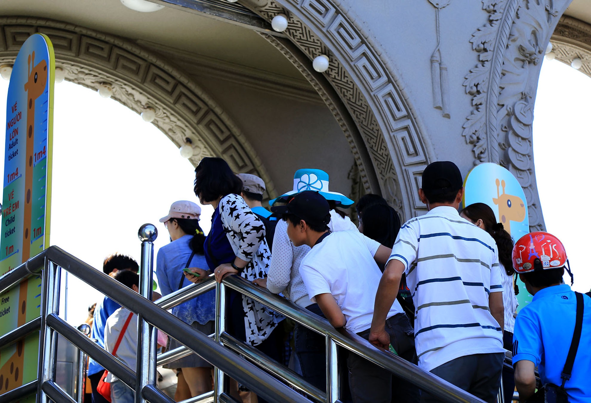 | Tại Khu du lịch Suối Tiên (quận 9), đến thời điểm gần trưa, sau khi mua vé nhiều người vẫn phải chờ đợi hàng dài để vào cổng. |