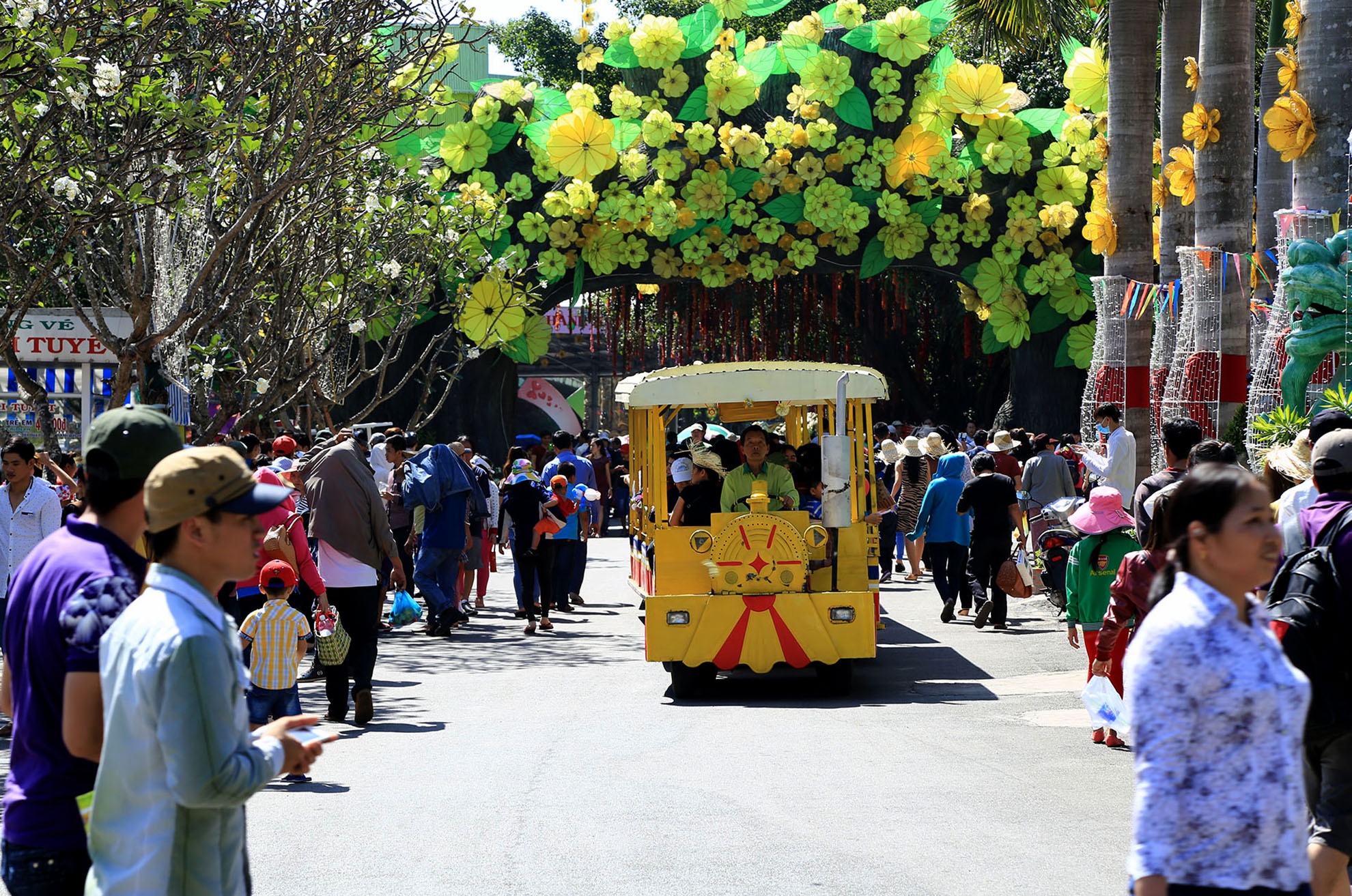 | Hàng chục xe điện hoạt động hết công suất để đưa đón khách tới các điểm tham quan. Theo đại diện khu du lịch này, trong buổi sáng 1/1, đã có đến 35.000 khách tới tham quan tại đây. |