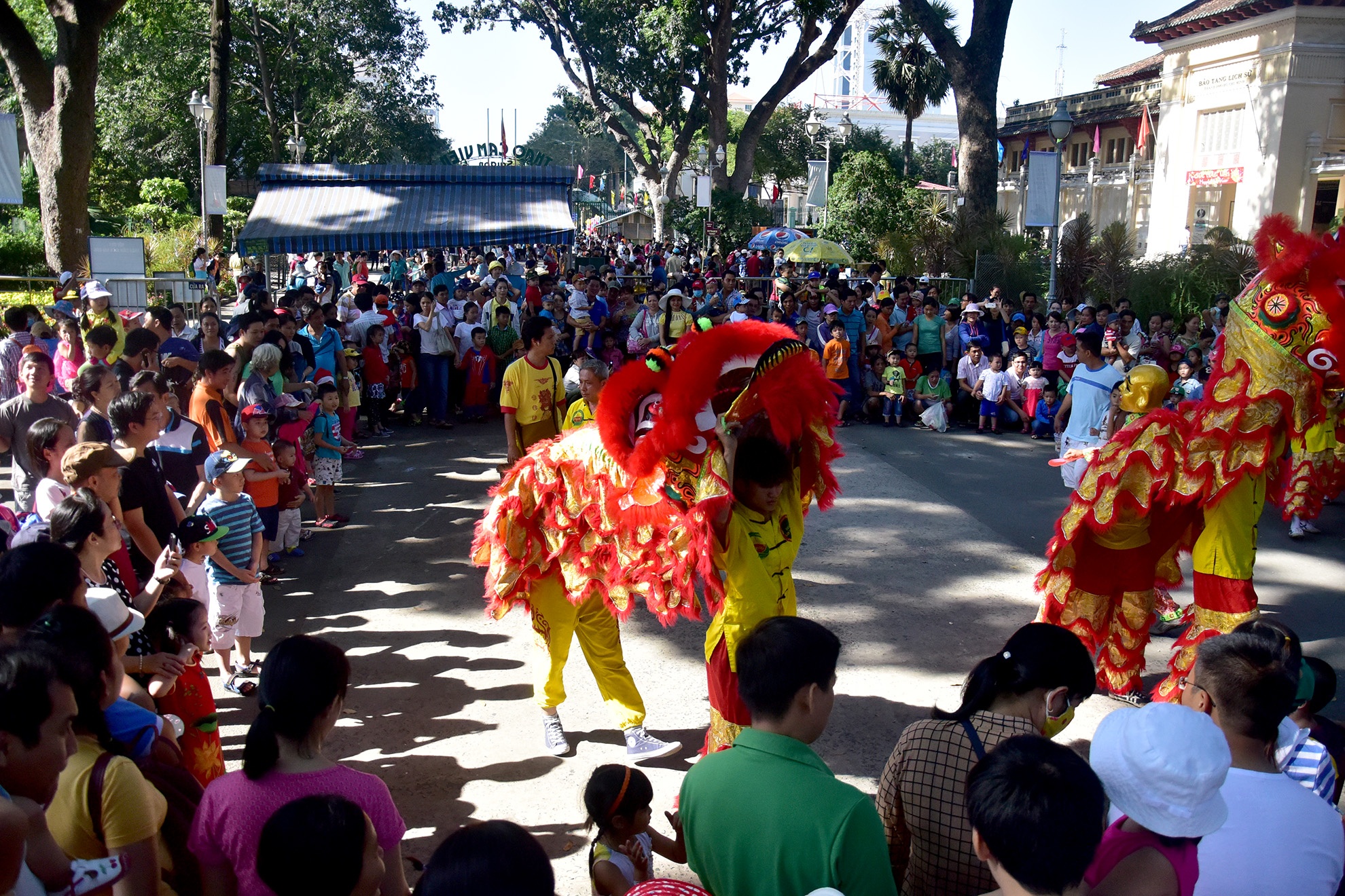 | Nhiều người tập trung xem một đoàn múa lân biểu diễn trước khu vực cổng chính sở thú. |