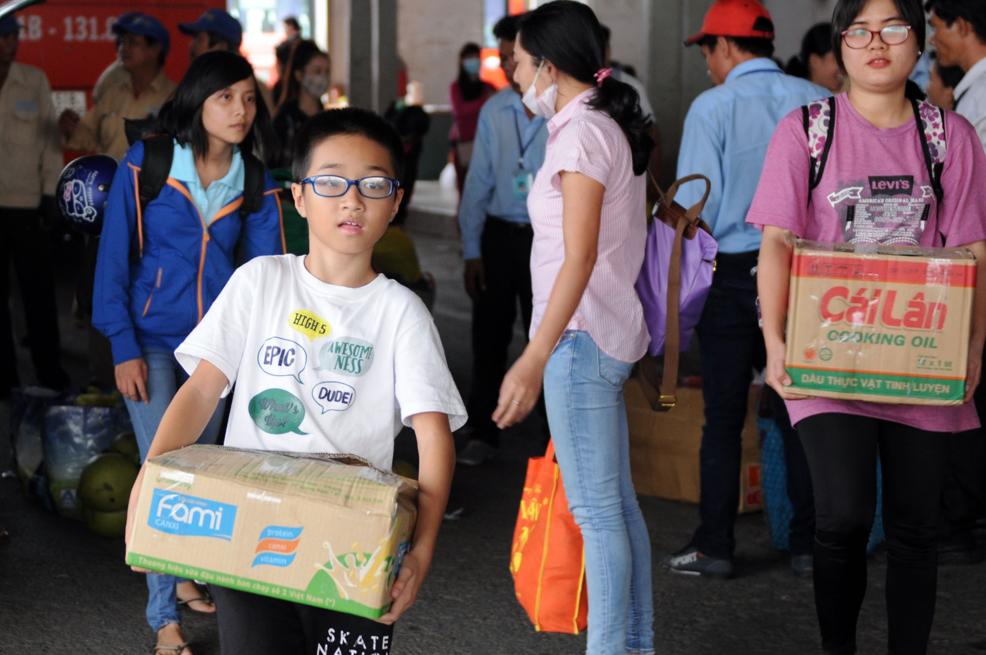 | Em Tuấn Kiệt (10 tuổi) cùng chị gái về quê ngoại ở Trà Vinh để nghỉ lễ. Do ông bà cho nhiều quà nên em phải phụ chị bê đồ khi vừa tới bến xe miền Tây. |