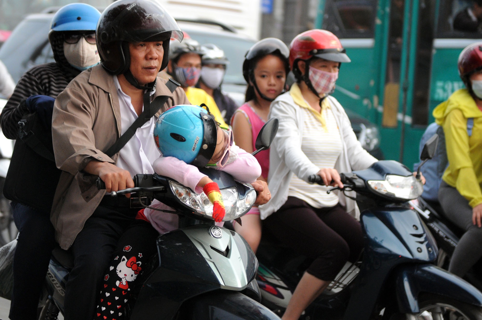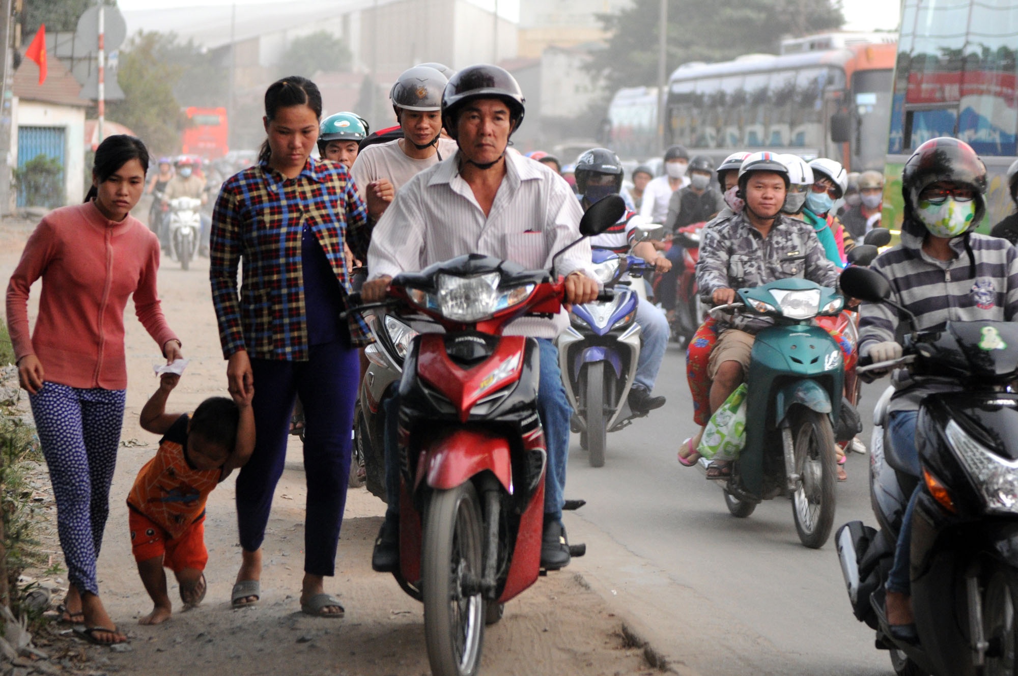 | Nhiều em bé khác ngồi trên xe ngủ gục sau chặng đường dài. Hình ảnh tại quốc lộ 1 đoạn thuộc huyện Bình Chánh. |