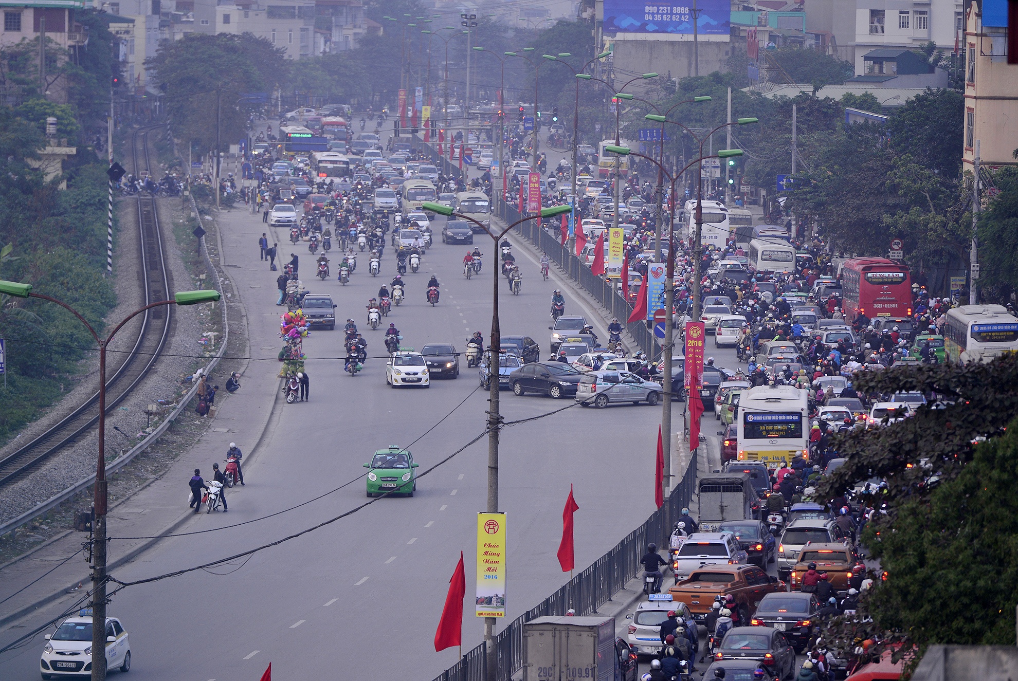 | Tại Hà Nội: Dòng xe ùn ứ nối dài trên đường Giải Phóng, đoạn gần bến xe Nước Ngầm, Giáp Bát chiều 3/1. |