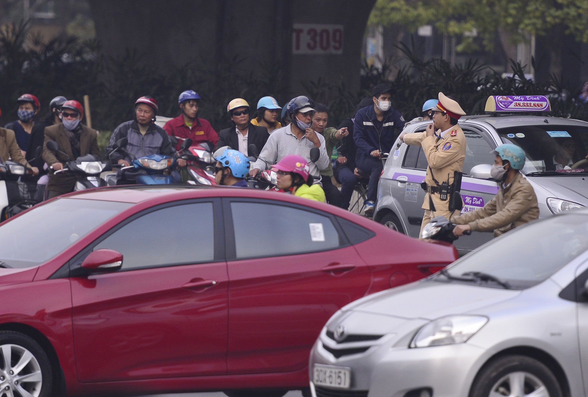 | Cảnh sát giao thông Hà Nội làm việc vất vả ở khu vực gần bến xe Mỹ Đình. |
