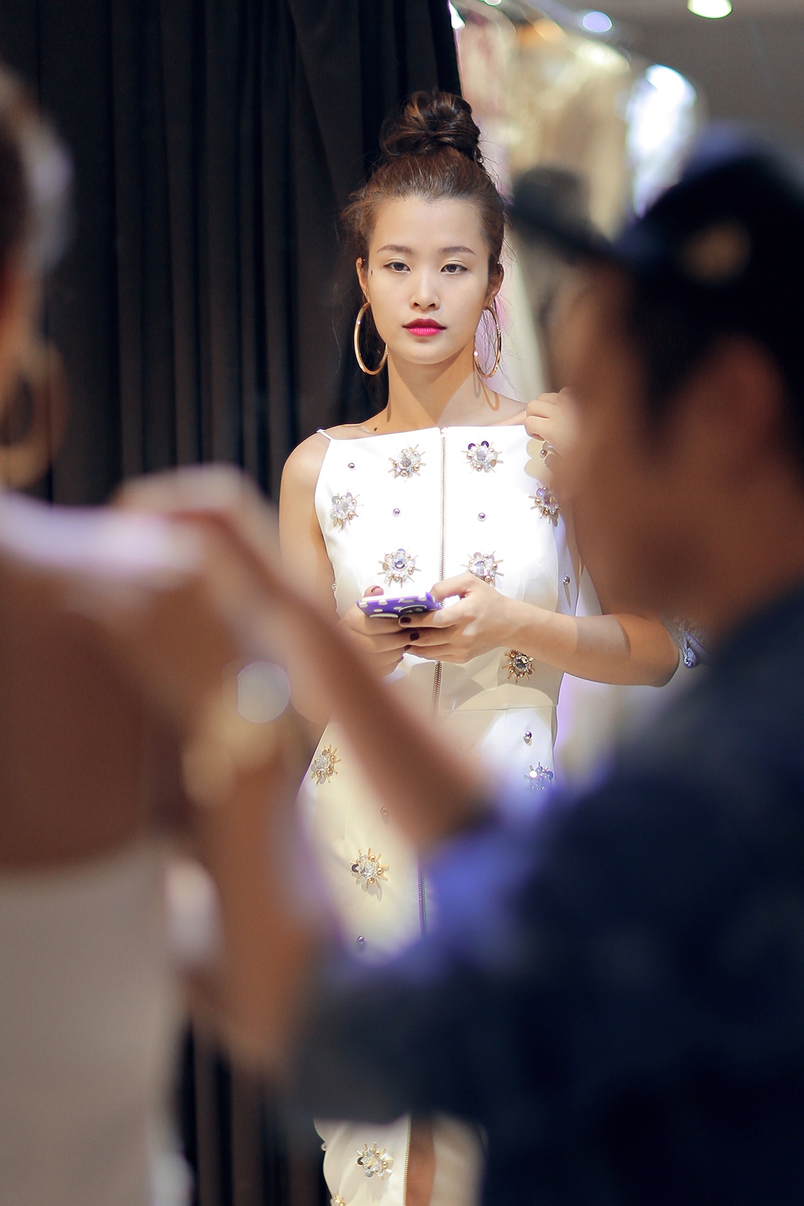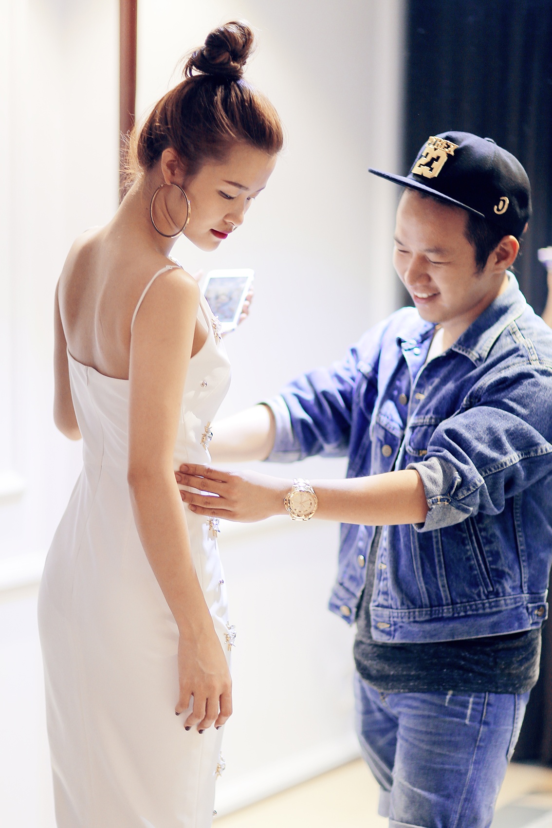 | Chiều 22/5, Đông Nhi tranh thủ ghé showroom của nhà thiết kế Chung Thanh Phong để thử trang phục cho sự kiện Đêm hội chân dài diễn ra buổi tối cùng ngày. |