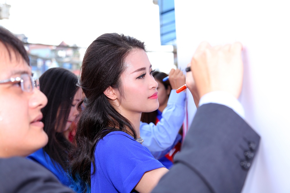 | Đông Nhi còn tham gia viết còn viết lời chúc đầu tiên lên tấm thiệp khổng lồ. |
