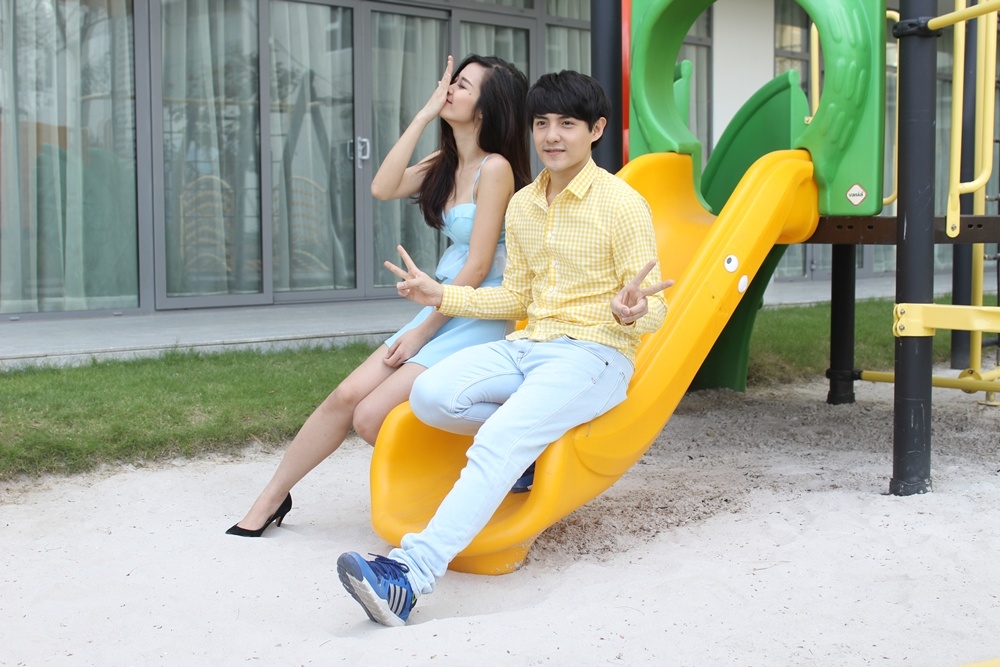 Trên trường quay MV "Sẵn sàng bùng nổ", trong khi các nghệ sĩ khác tưng bừng nghịch nước dưới hồ bơi, cặp đôi luôn quấn lấy nhau không rời.