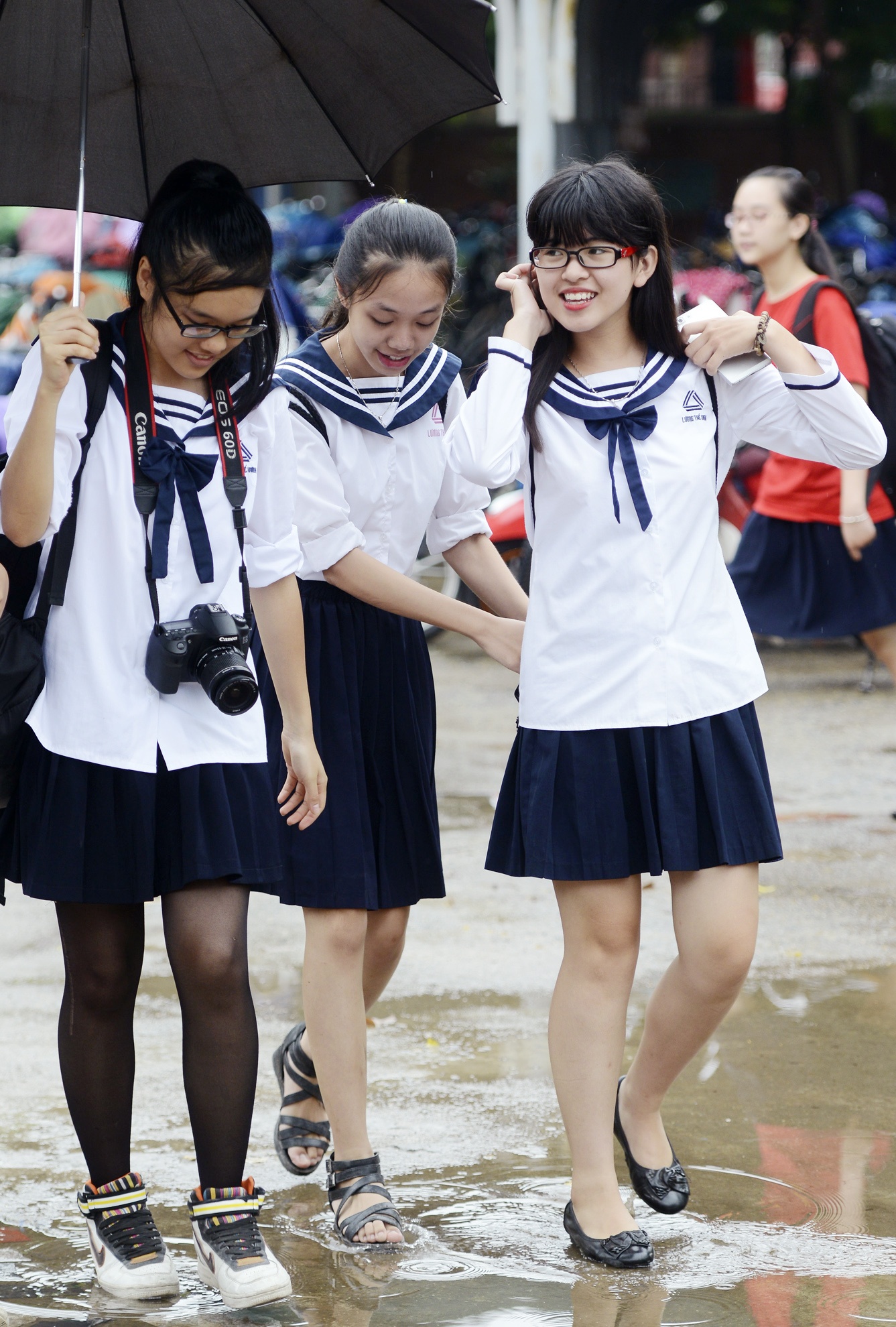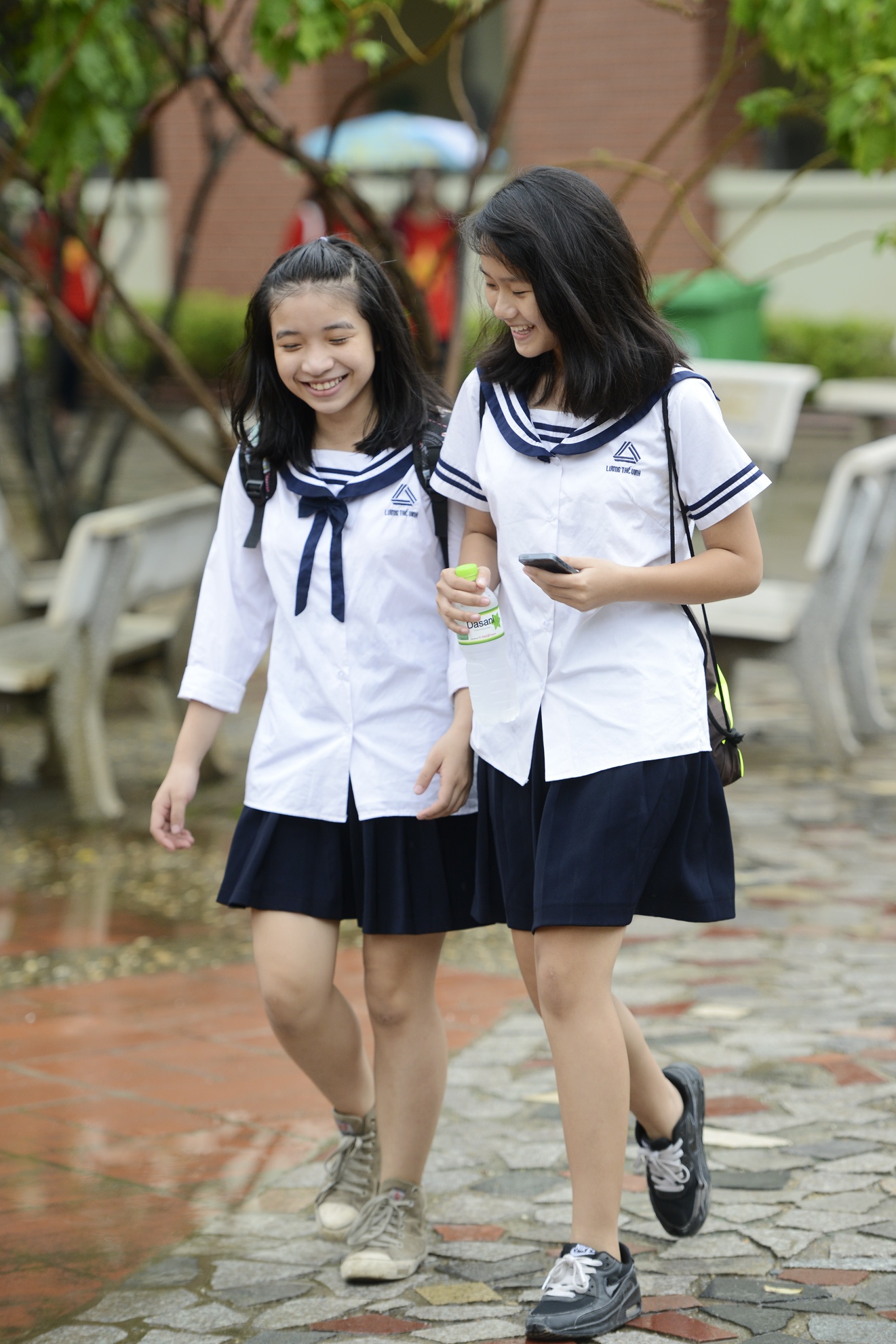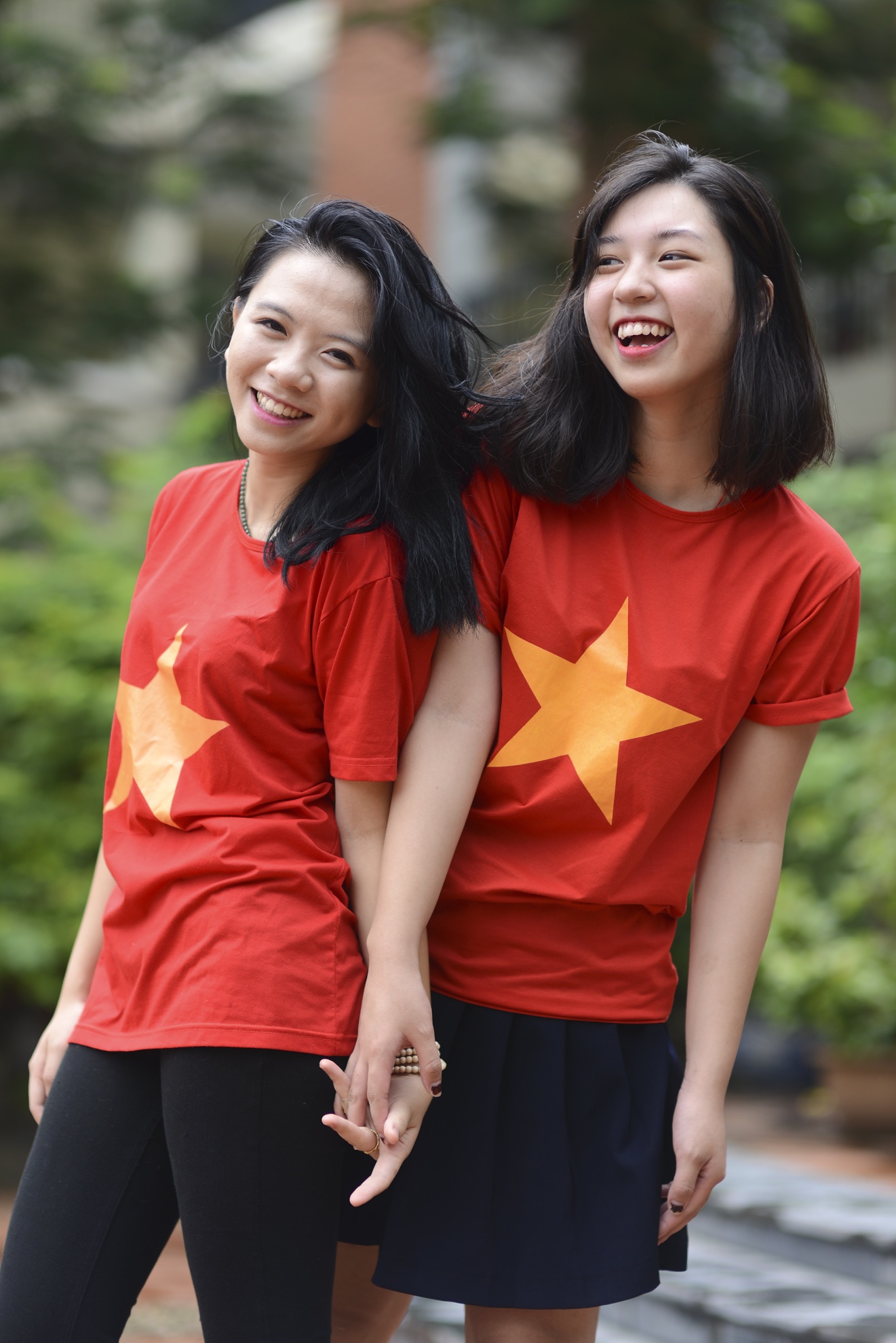 | Các nữ sinh vui cười trong trang phục của trường. Diệu Quỳnh (phải) cho biết: "Ngay từ khi vào trường, mình đã ấn tượng với chiếc áo đồng phục này. Tuy nhiên, để so sánh giữa hai bộ, mình thích mẫu thủy thủ hơn bởi thiết kế này giúp chúng mình khoe được sự dịu dàng, nữ tính so với áo cờ đỏ sao vàng". |