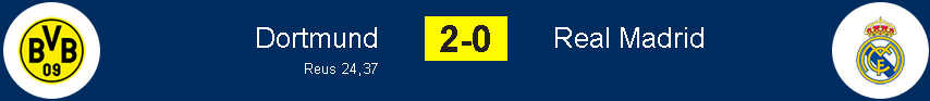 Thi đấu bùng nổ trong hiệp 1 nhờ sự cổ vũ cuồng nhiệt của khán giả nhà và sai lầm sơ đẳng ở hàng thủ Real Madrid, Dortmund xứng đáng có 2 bàn thắng được ghi, đều do công của Marco Reus. Sang hiệp 2, đội chủ sân Signal Iduna Park tiếp tục dồn ép đối thủ nhưng may mắn không mỉm cười với đội bóng vàng-đen.