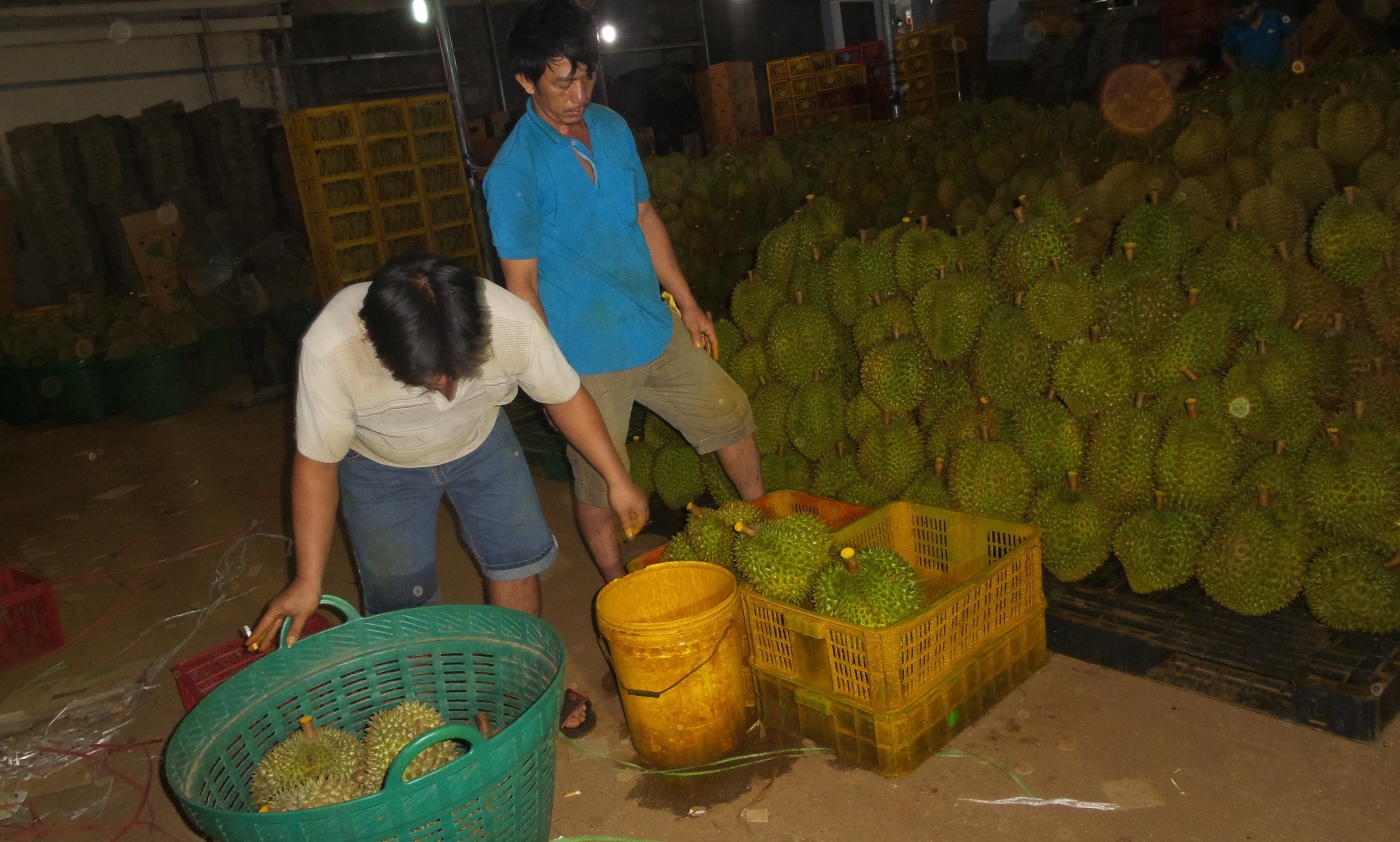 Theo chủ cơ sở, nhúng sầu riêng vào thùng hóa chất để trái chín vàng đều sau một đêm. Sau đó sẽ gọi thương lái đến lấy xuất đi thị trường Trung Quốc hoặc bỏ mối cho lò chế biến trái cây sấy khô.