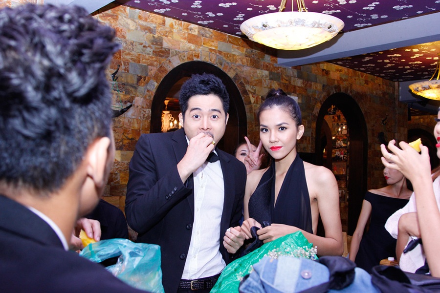 | Thanh Hằng nhí nhảnh phía hậu trường. |