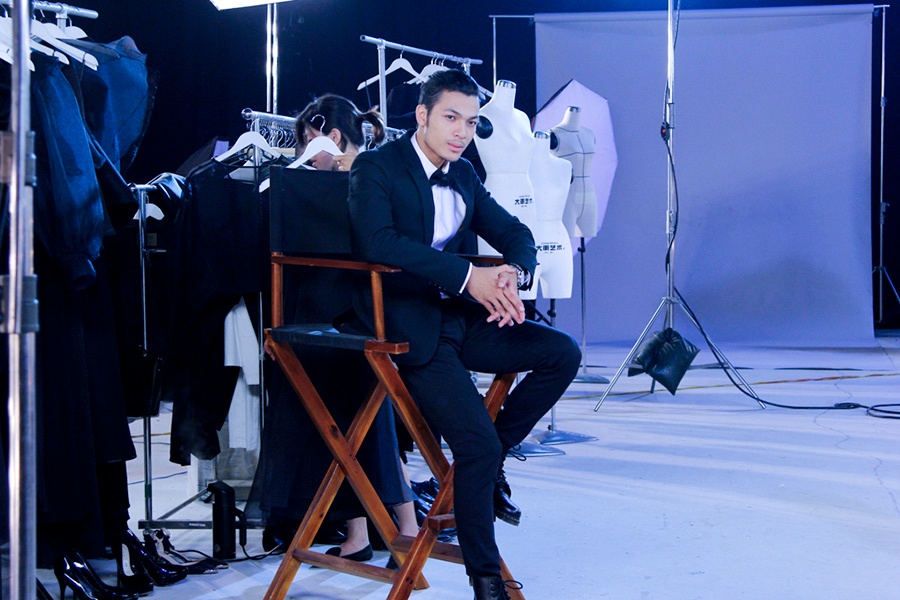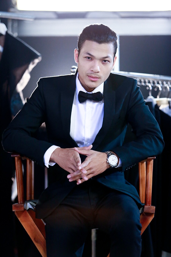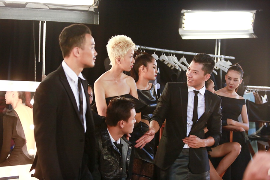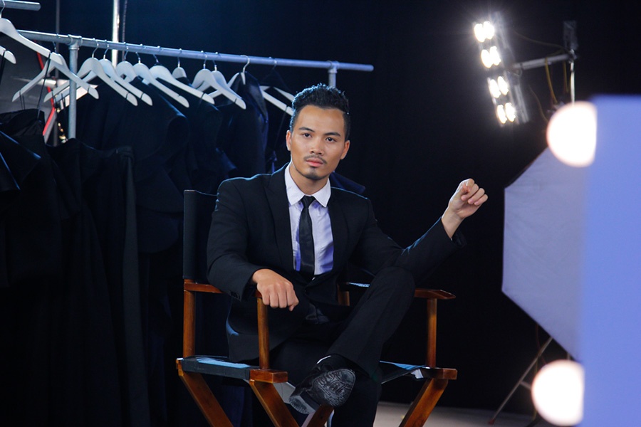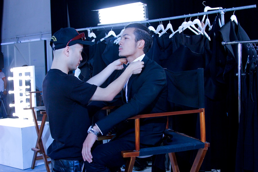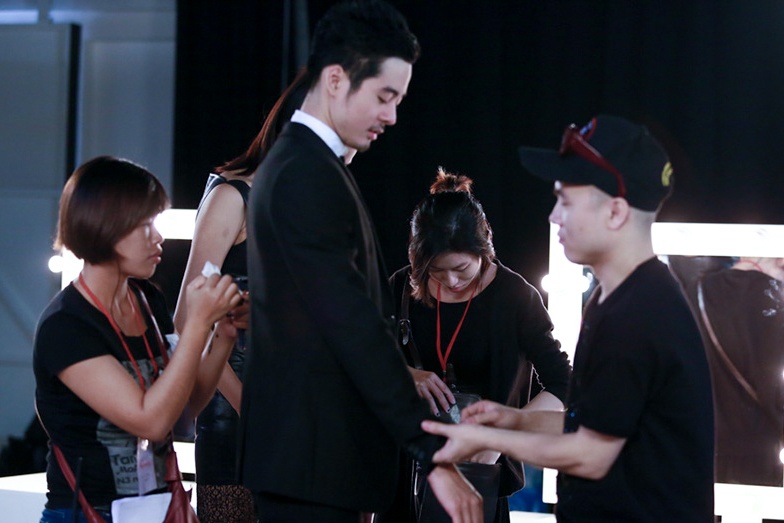 | Đỗ Mạnh Cường chỉnh sửa trang phục cho thí sinh nam Tuấn Việt. |