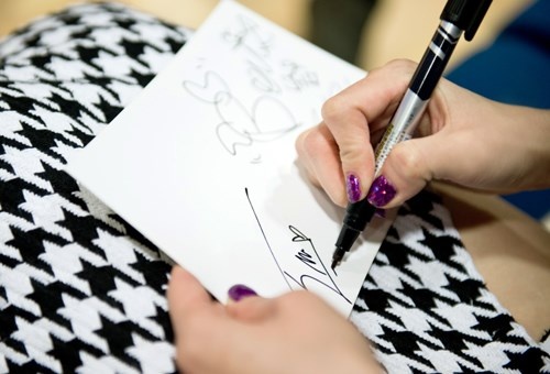 | Các cô nàng viết và ký tặng trên thiếp. |