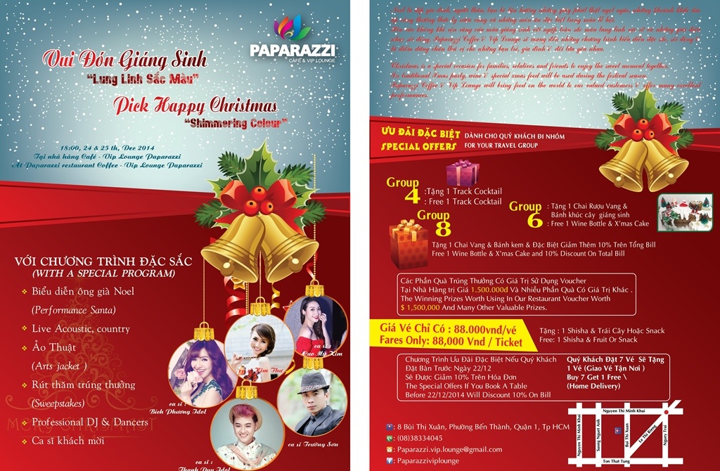 Ở đêm tiệc chính ngày 25/12 từ 18h, với sự góp mặt của nữ ca sĩ đáng yêu Cao Mỹ Kim sẽ mang đến cho bạn một buổi tối khó quên. Thêm vào đó, sự xuất hiện của các ảo thuật gia cùng các tiết mục vô cùng thú vị sẽ mang đến bạn cùng người thân yêu những trải nghiệm tuyệt vời. Bên cạnh đó, Paparazzi Cafe & V.I.P Lounge tạo cơ hội để bạn nhận ngay những phần quà quà ý nghĩa và đầy giá trị dành cho các các cặp đôi, nhóm bạn hay gia đình, qua chương trình rút thăm may mắn giành cho những vị khách hạnh phúc nhất trong đêm Noel. Ngoài ra, khách hàng còn có cơ hội nhận ngay voucher trị giá từ 1 triệu đồng đến 1,5 triệu đồng. Đặc biệt, chương trình ca nhạc phong phú do chính ban nhạc của nhà hàng thể hiện diễn ra trong không gian vui tươi và ánh đèn ấm áp.