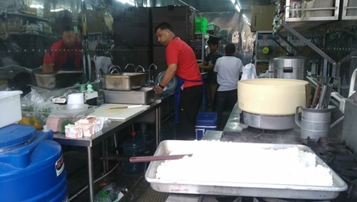Bếp nấu ăn được đặt trên một chiếc container, có cả món Tây và món Việt. |
