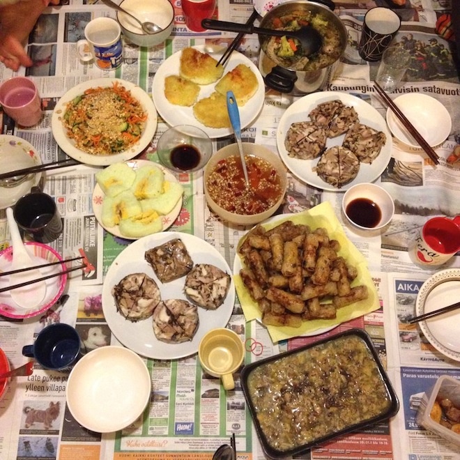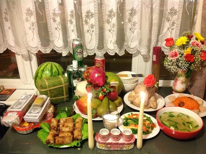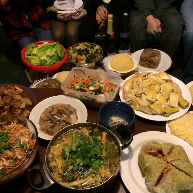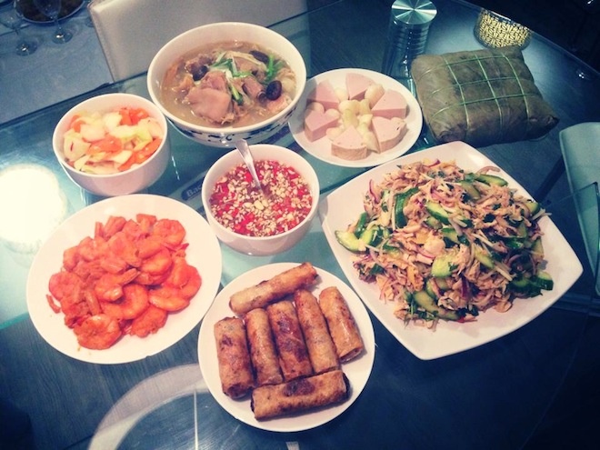 | Cô bạn An Chúc (hiện đang sống tại London, Anh) đảm đang, chia sẻ bàn cỗ hoành tráng của mình. |