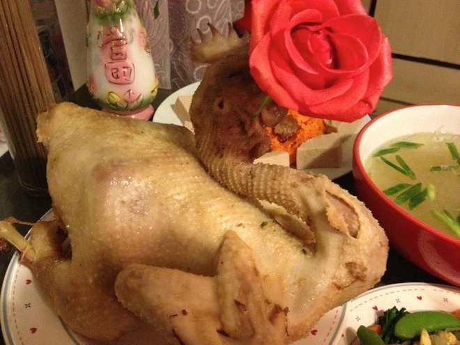 | Gà sống ngậm hoa hồng cũng "sẵn sàng" lên bàn cúng. |