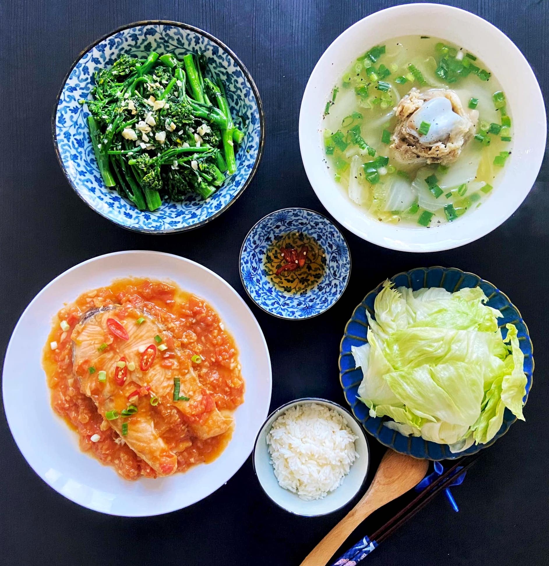 - Canh cải xương heo, cá hồi sốt cà, bông cải xào, xà lách