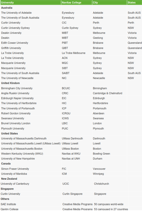 Hơn 110 trường cao đẳng và cơ sở học thuật tại 27 quốc gia trên thế giới đã và đang đào tạo cho trên 80.000 sinh viên chọn học cùng Navitas. 32 trường cao đẳng chuyển tiếp đại học ở 8 quốc gia, trong đó có Anh, Mỹ, Canada, Úc, New Zealand và Singapore đáp ứng đủ mọi nguyện vọng và nhu cầu của sinh viên. Navitas liên kết với 27 trường đại học hàng đầu trên toàn cầu, sự đảm bảo chắc chắc cho một bằng cấp quốc tế uy tín.