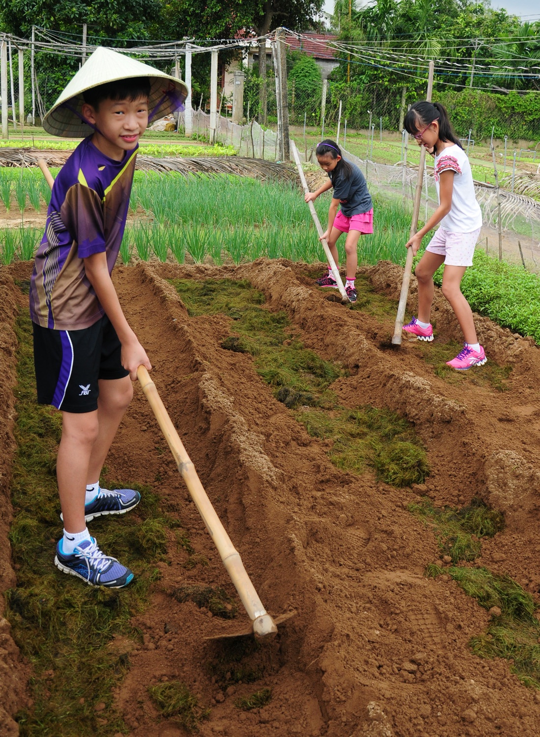 Trẻ em Singapore tập làm nông dân cuốc đất trồng rau. "Chúng tôi được khám phá đồng quê, như trở về với thiên nhiên và có nhiều trải nghiệm tuyệt vời", ông Iron Man Chef Hewan (du khách đến từ đảo quốc sư tử) nói.