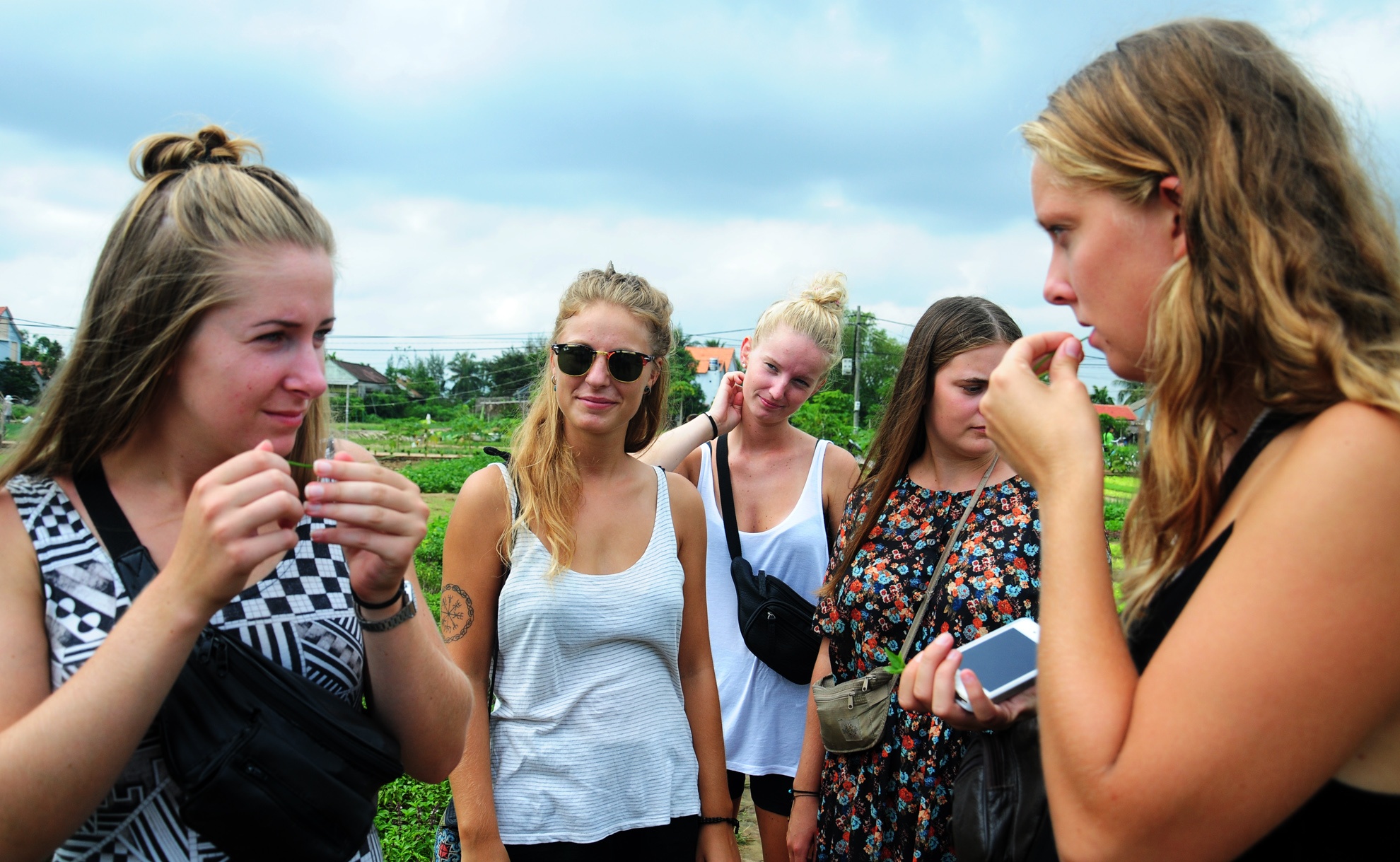 Nhóm nữ du khách Đức tỏ ra lạ lẫm trước hương thơm đặc biệt của cọng rau hẹ ở làng rau Trà Quế.