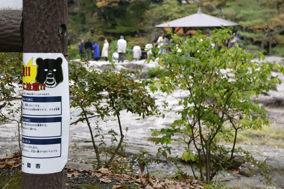 | Tờ cảnh báo gấu được dán tại một suối nước nóng gần nơi một người dân bị gấu tấn công tử vong ở quận Gembi, thành phố Ichinoseki. Ảnh: Kyodo. |