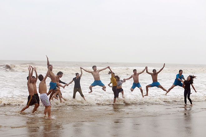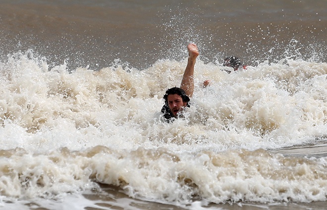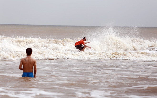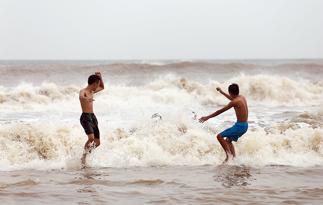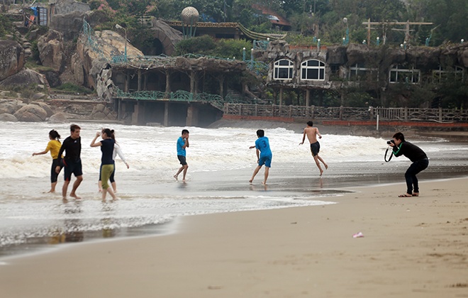 | Nhiều bạn trẻ nô đùa tại biển Sầm Sơn, Thanh Hóa chiều 10/11 dù biết tin siêu bão Haiyan đang tiến dần về khu vực này. |