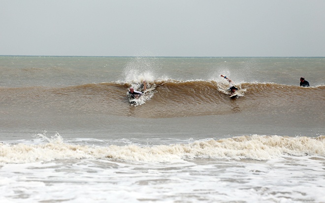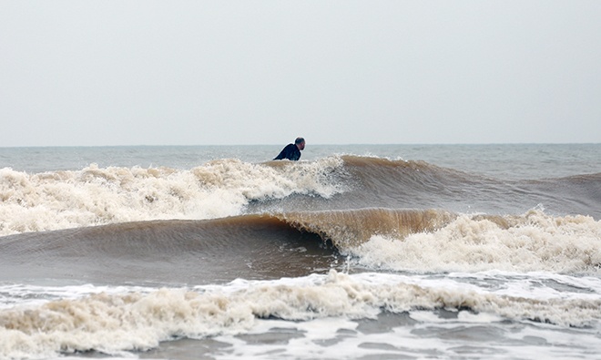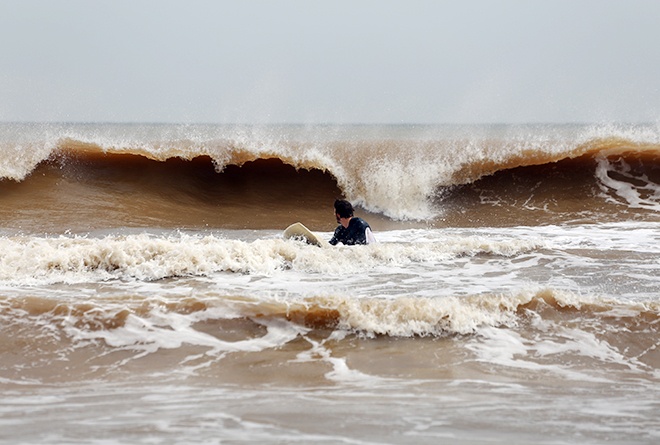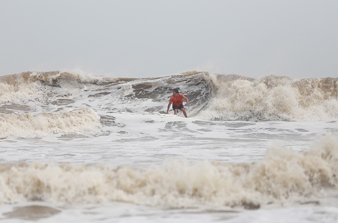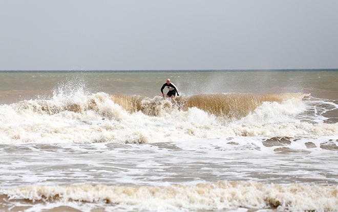 | Họ tỏ vẻ khá thích thú đùa giỡn với những đợt sóng cao tới 2m. |