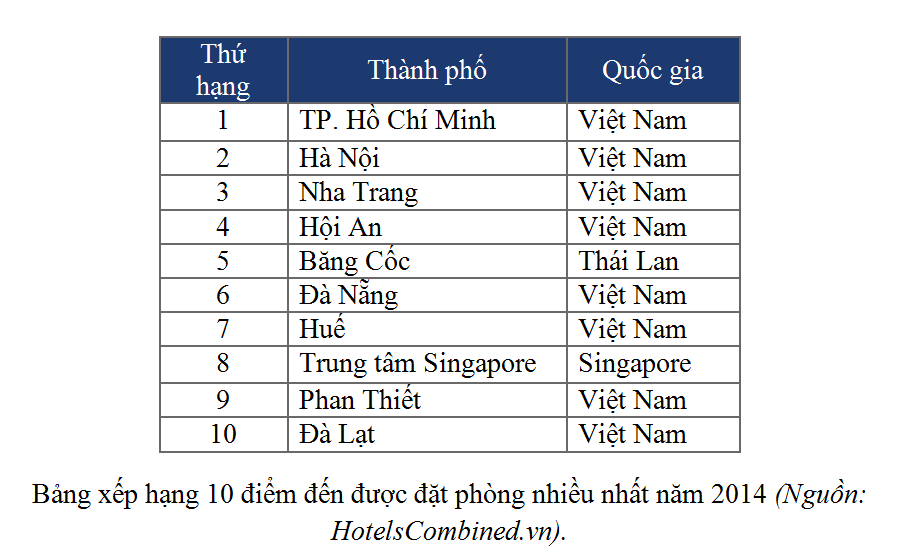 Theo thống kê của HotelsCombined.vn, năm 2014, TP HCM là điểm đến được khách du lịch Việt Nam đặt phòng nhiều nhất trong năm 2014. Nơi đây nổi tiếng với nhịp sống hối hả nhưng bạn trẻ vẫn có thể chọn cho mình những điểm đến bình yên như Nhà hát Thành phố, chợ Bến Thành, Bảo tàng Mỹ thuật… Các kiến trúc của Sài Gòn - Hòn ngọc Viễn Đông xưa được giữ gìn và tôn tạo, trở thành những điểm tham quan lý thú. Đến thành phố này, du khách còn bất ngờ với những đại lộ rợp bóng cổ thụ trăm năm, con đường đầy sắc hoa, khu biệt thự thanh bình.