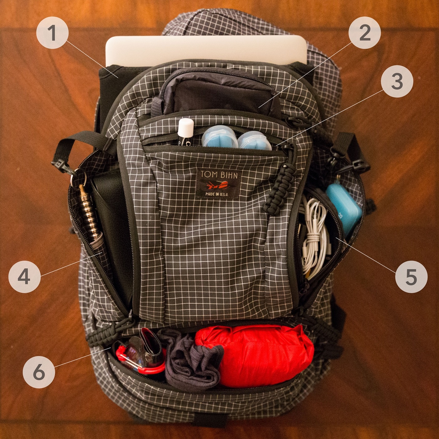 1. Ngăn chính: xếp quần áo, quấn áo quanh laptop, mang theo mặt nạ che mắt.
