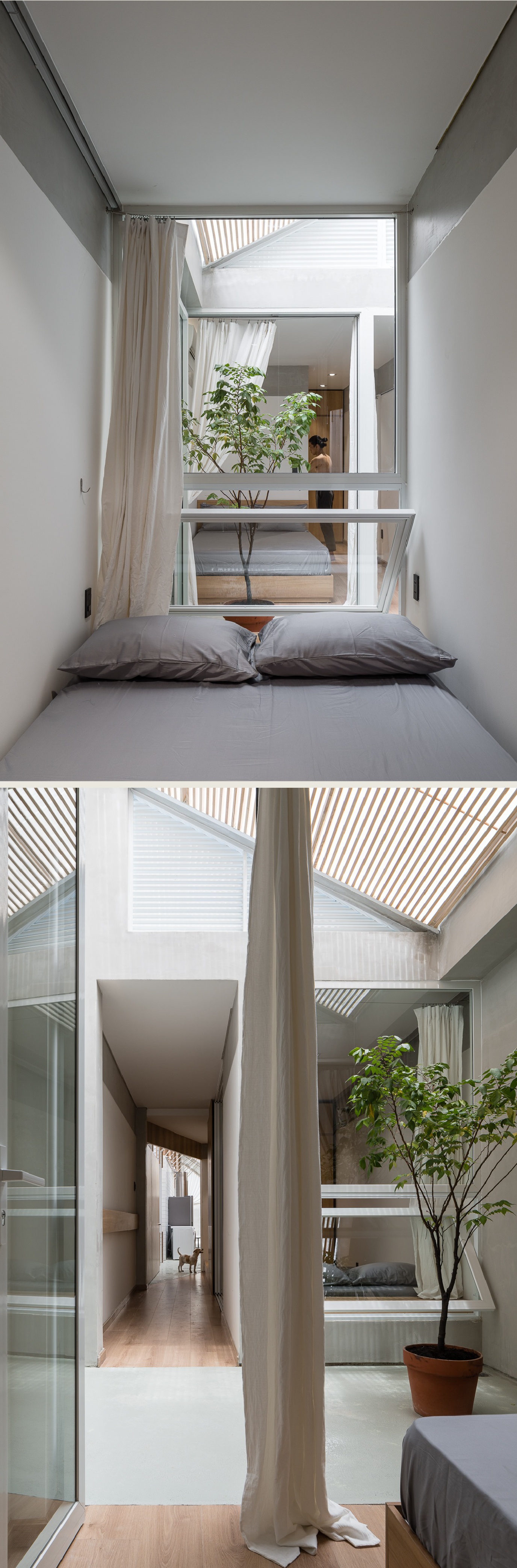 Hai khoảng sân ở trước và giữa nhà cũng giúp giải quyết vấn đề chiếu sáng và thông gió cho công tình. Ở các vị trí khác nhau trong nhà đều ngập ánh sáng và gió tự nhiên.