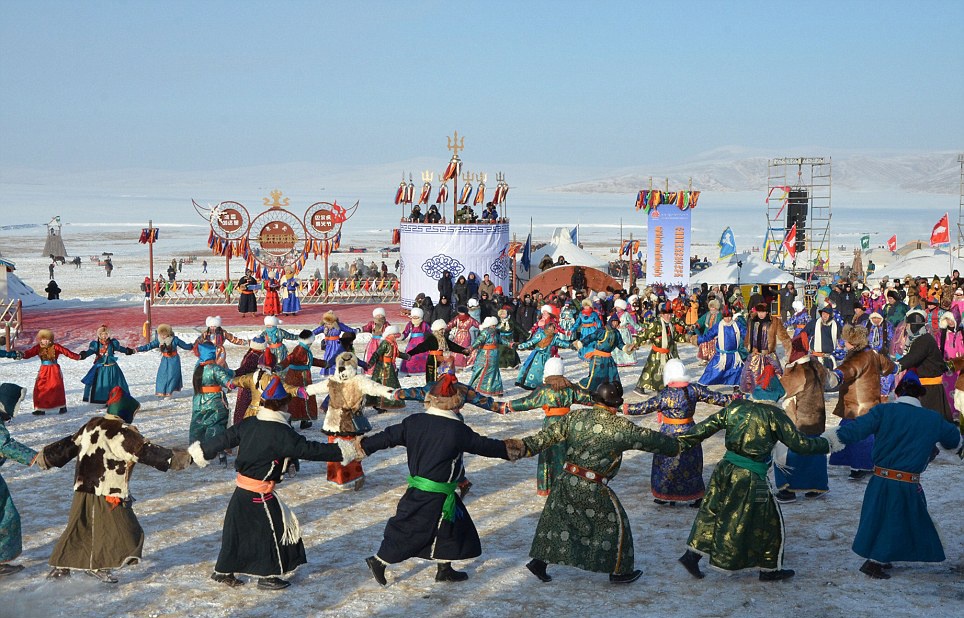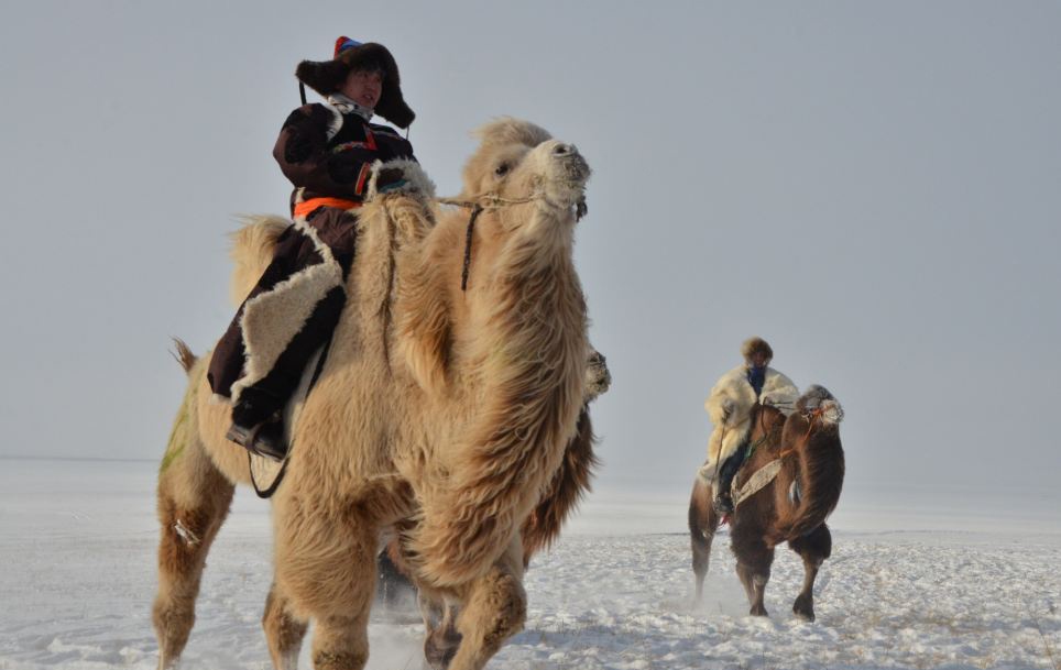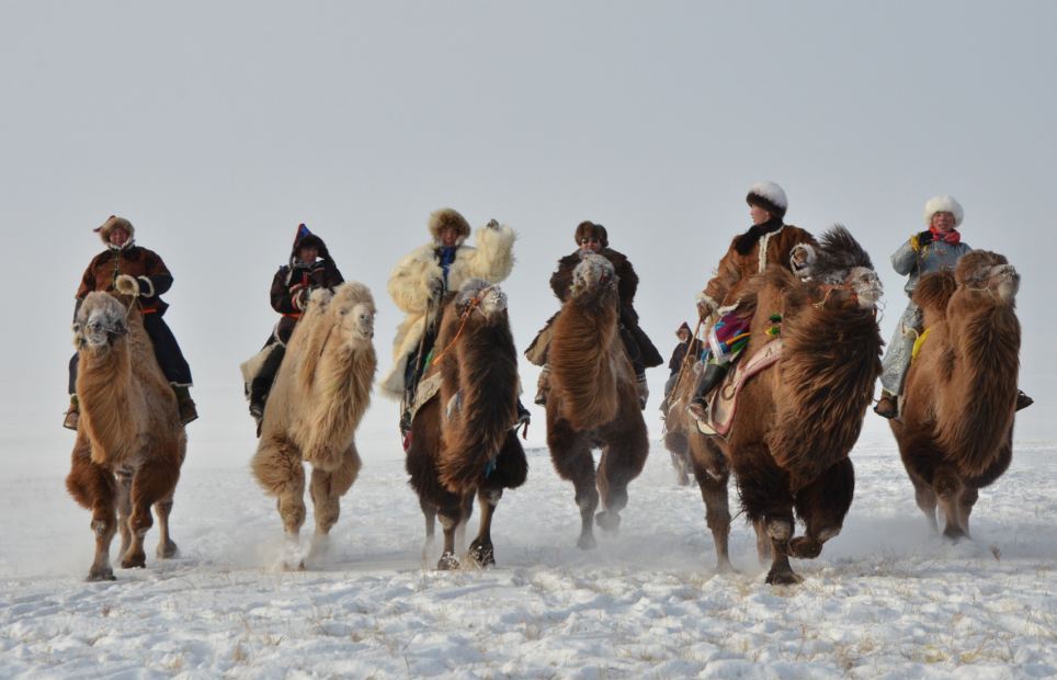 | Đàn ông Nội Mông cưỡi lạc đà trong lễ hội mùa đông Naadam Fair. Đây là dịp lễ hội truyền thống tổ chức tại Hulun Buir để ăn mừng mùa màng. Rất nhiều hoạt động diễn ra trong dịp này như đua lạc đà, đua ngựa, nhảy múa, bắn cung. Ảnh: Photoshot. |