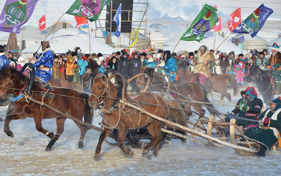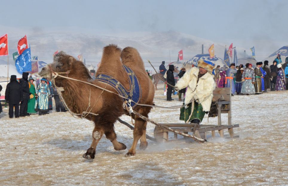 | Con lạc đà kéo xe trượt tuyết tại lễ hội. Theo tiếng của người dân địa phương, Naadam nghĩa là trò chơi. Ảnh: Photoshot. |