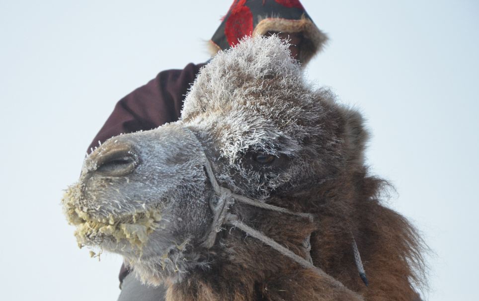 | Lạc đà và chủ chống chọi với cái rét xuống tới -34 độ C. Ảnh: Feature China. |