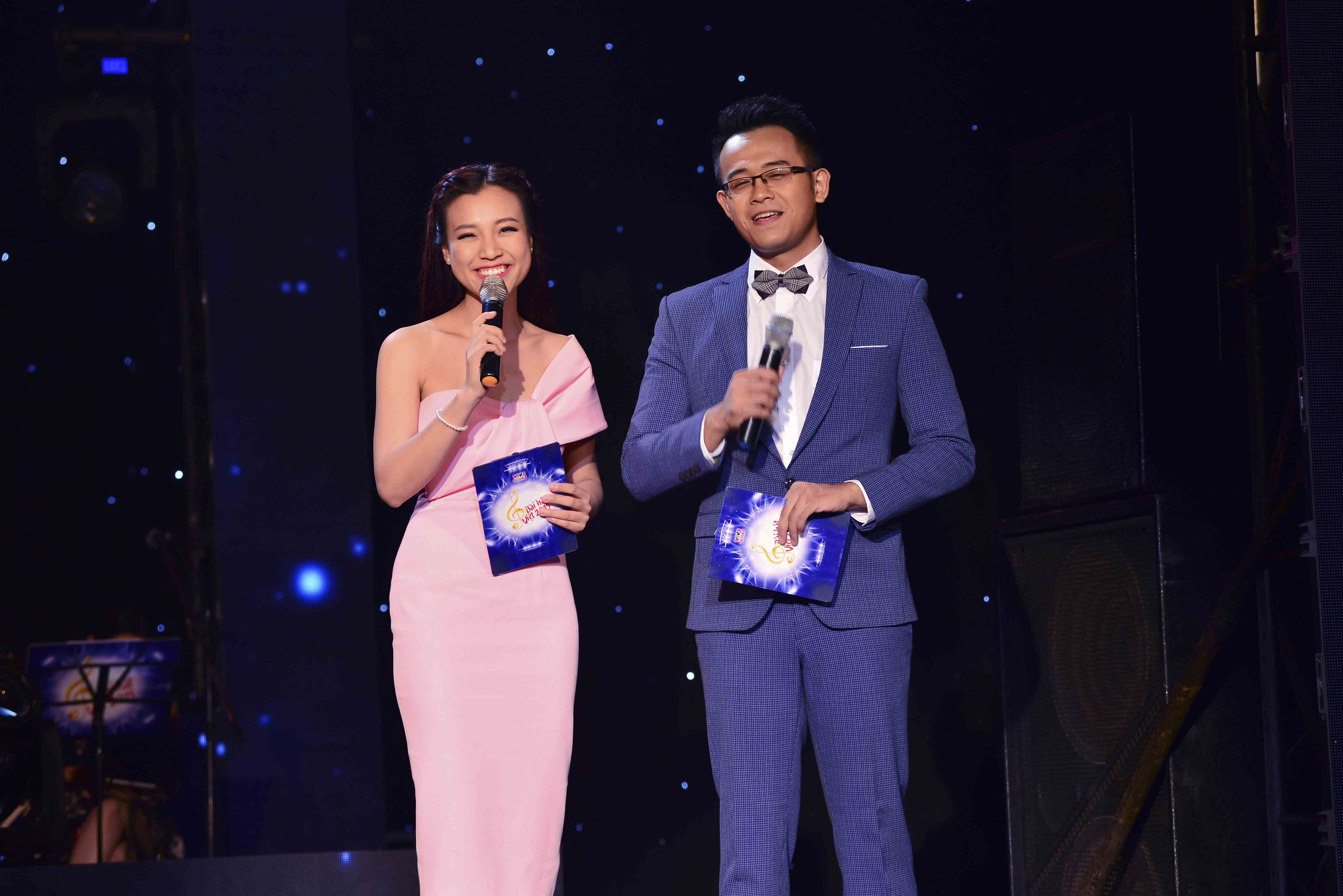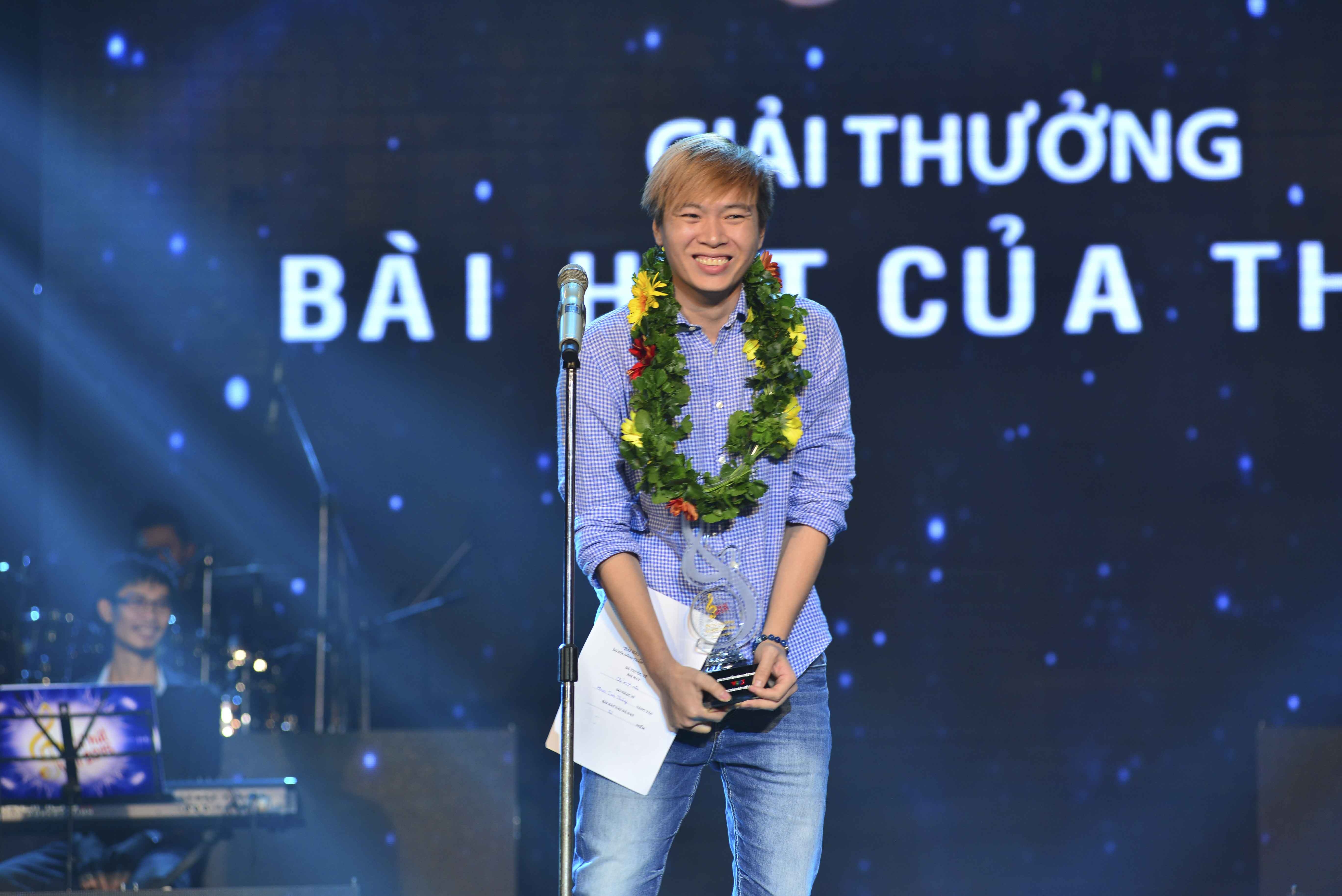 Phạm Toàn Thắng vui mừng nhận giải thưởng từ nhạc sĩ Huy Tuấn. Trước đó, ca khúc Bốn chữ lắm do anh sáng tác cũng từng khuynh đảo Bài hát Việt. |