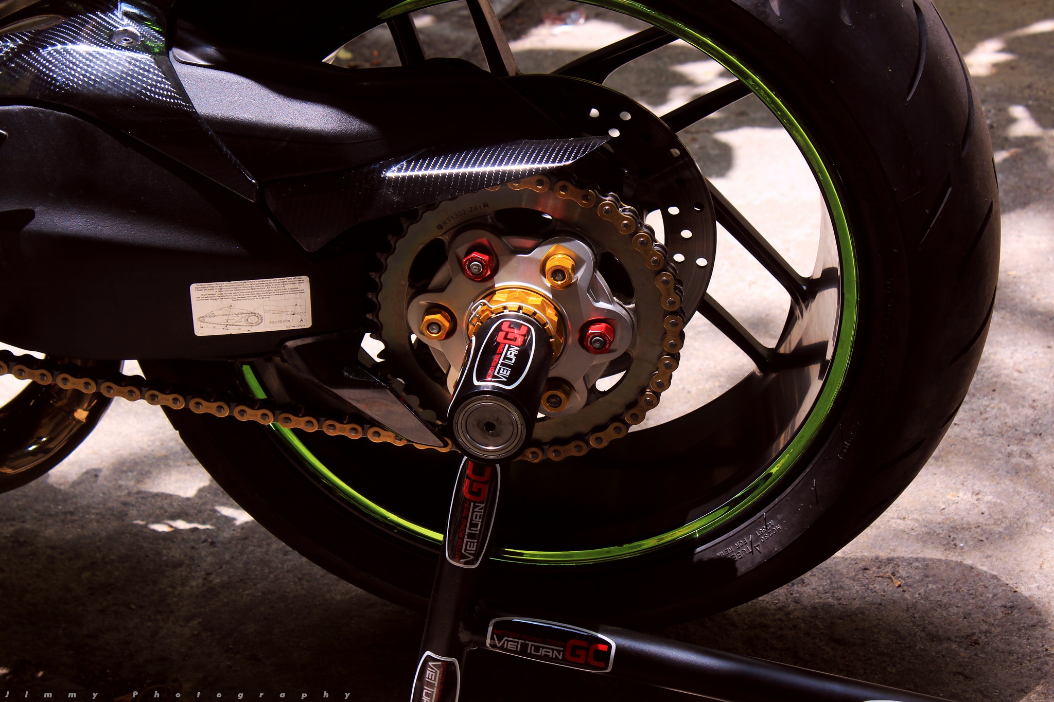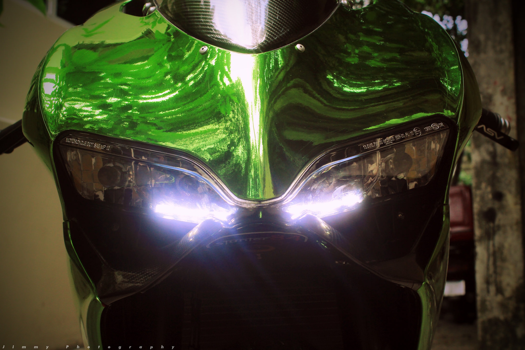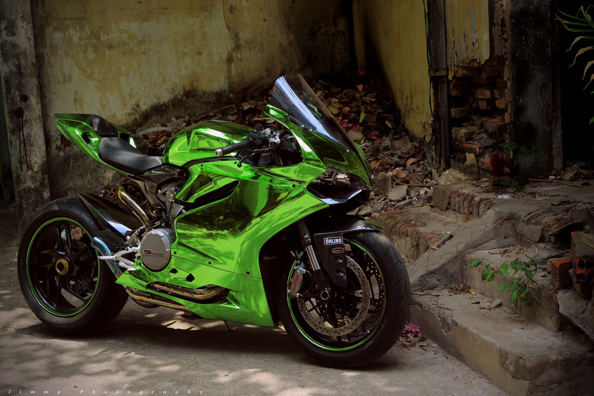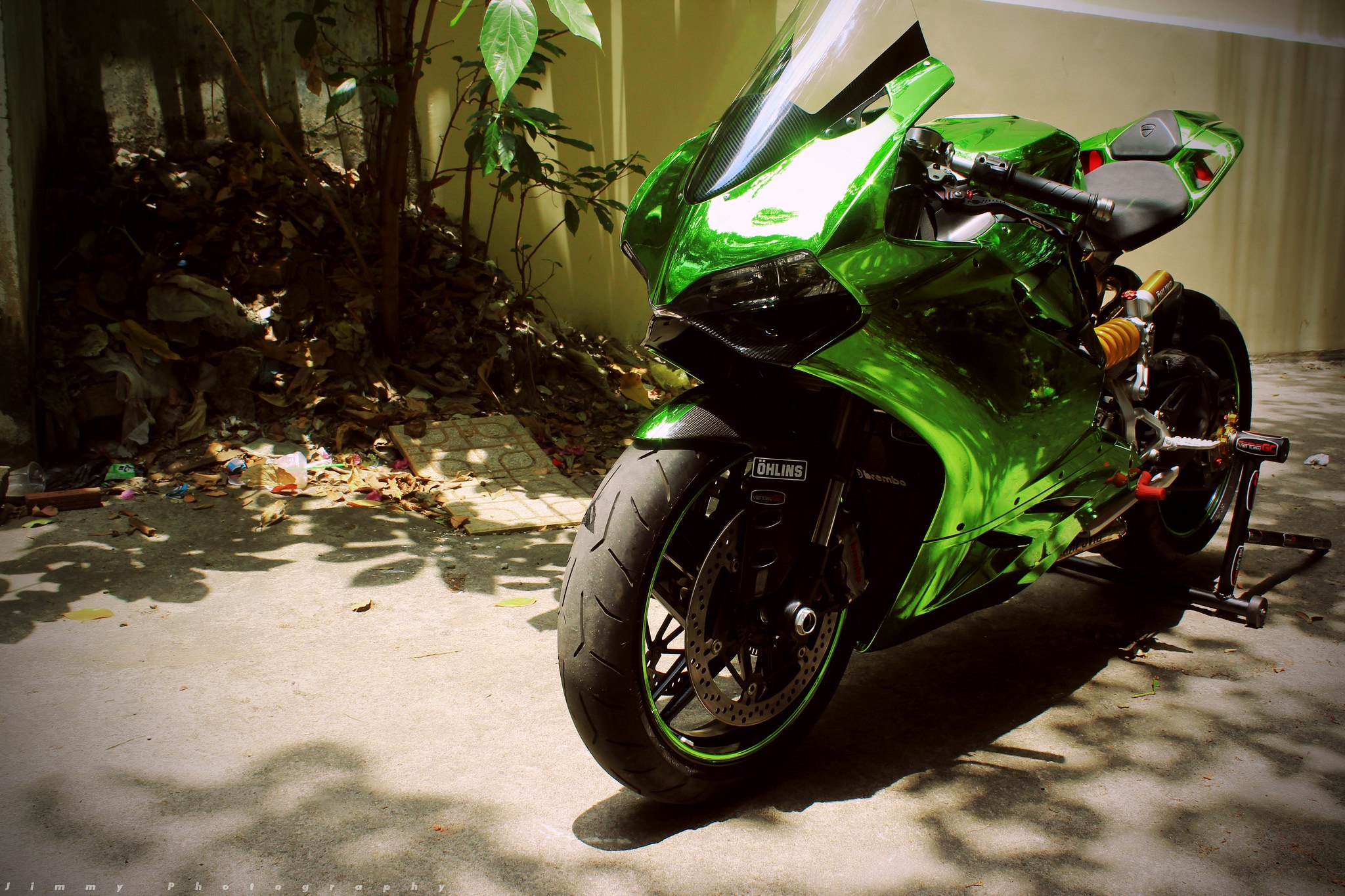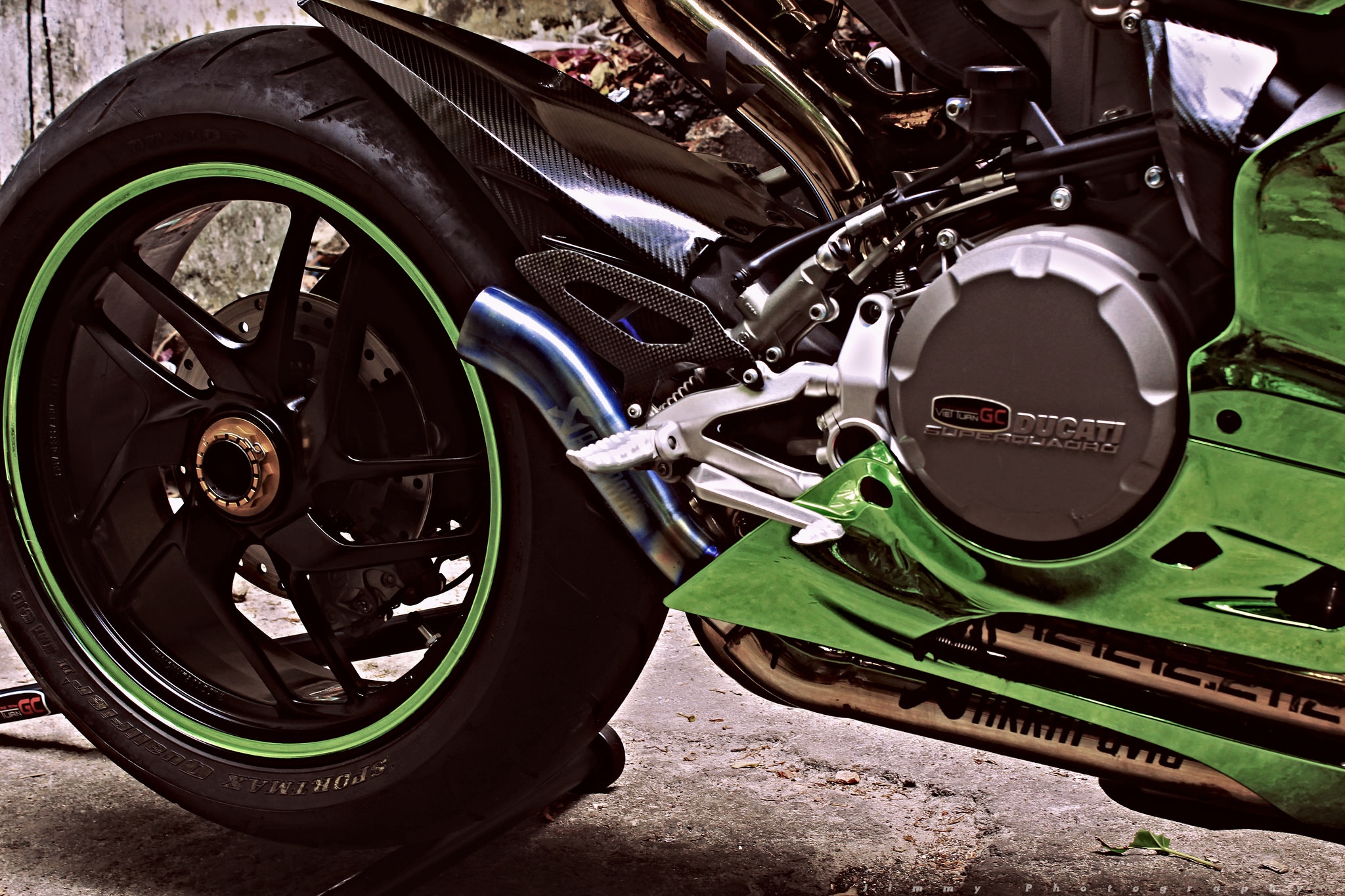 | Chiếc môtô thể thao hạng trung 899 Panigale của Ducati được một người chơi xe tại TP HCM biến thành mẫu xe độc nhất vô nhị nhờ lớp vỏ chrome xanh. Đây là phong cách độ thường thấy trên các loại siêu xe, đặc biệt là Lamborghini. |