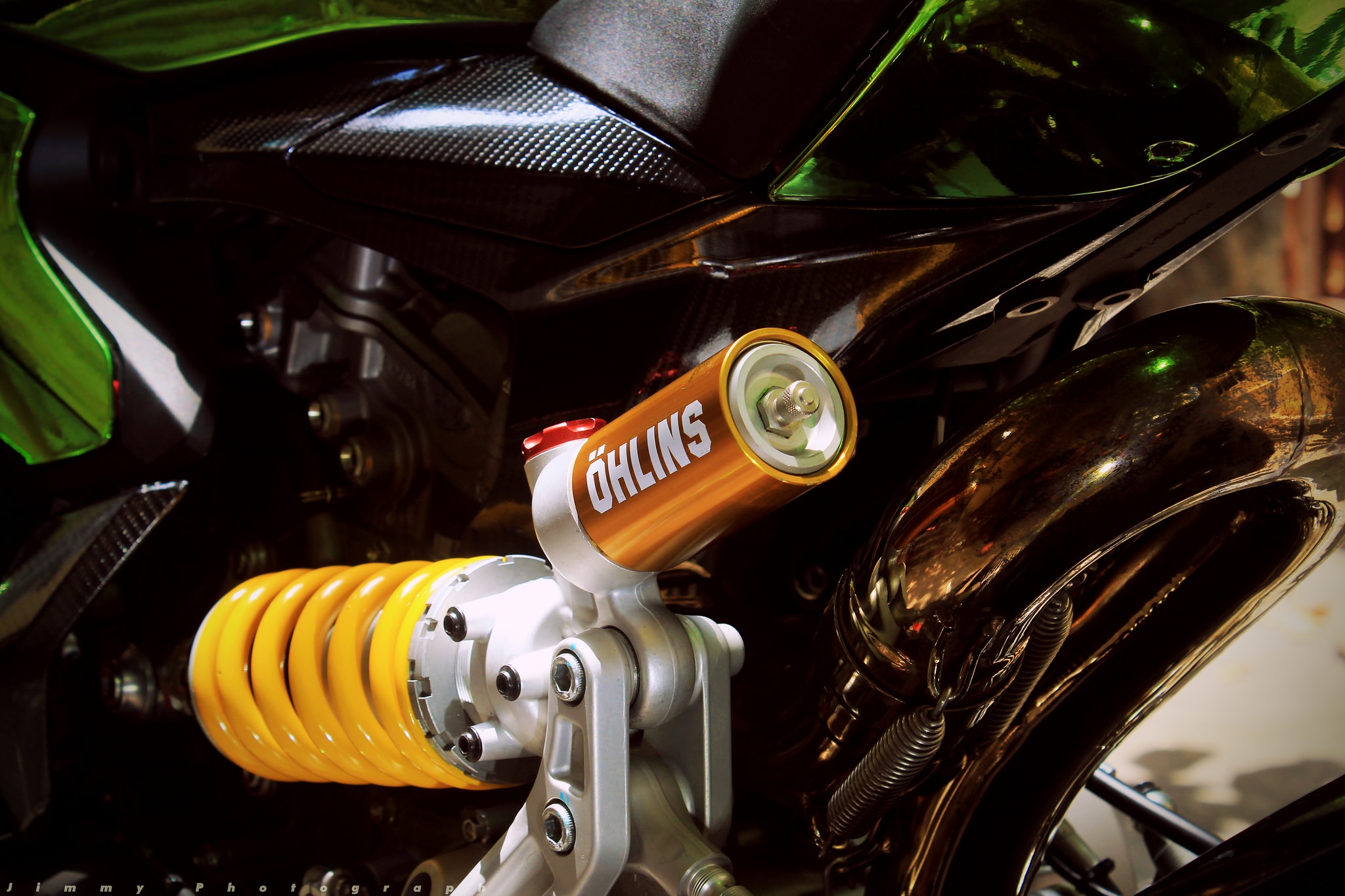 | Phuộc monoshock phía sau hiệu Ohlins với cơ cấu giảm sốc được thiết kế đặc biệt nhằm tăng độ ổn định khi xe chạy nhanh. Đây là phuộc được lấy từ 1199 Panigale. |