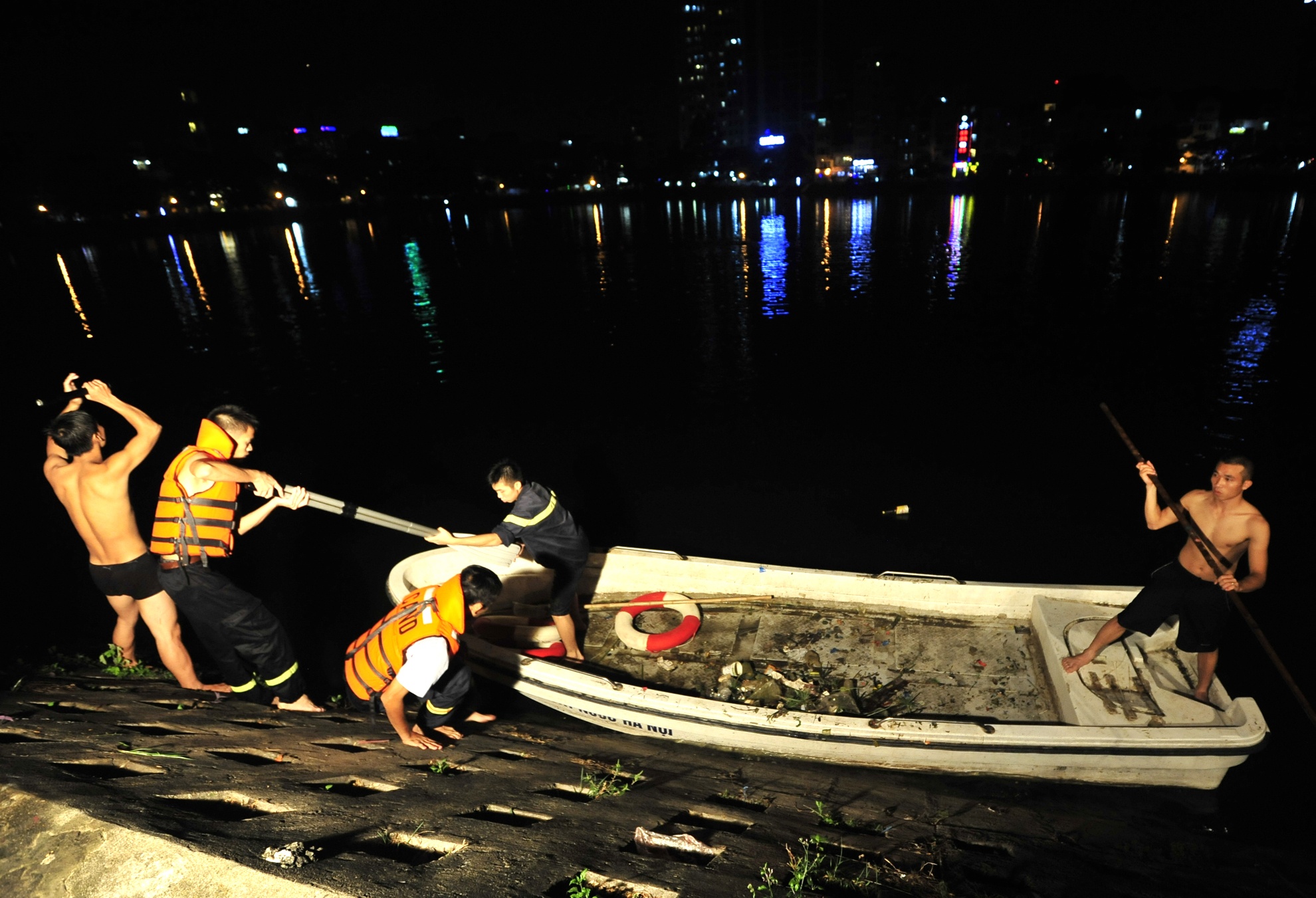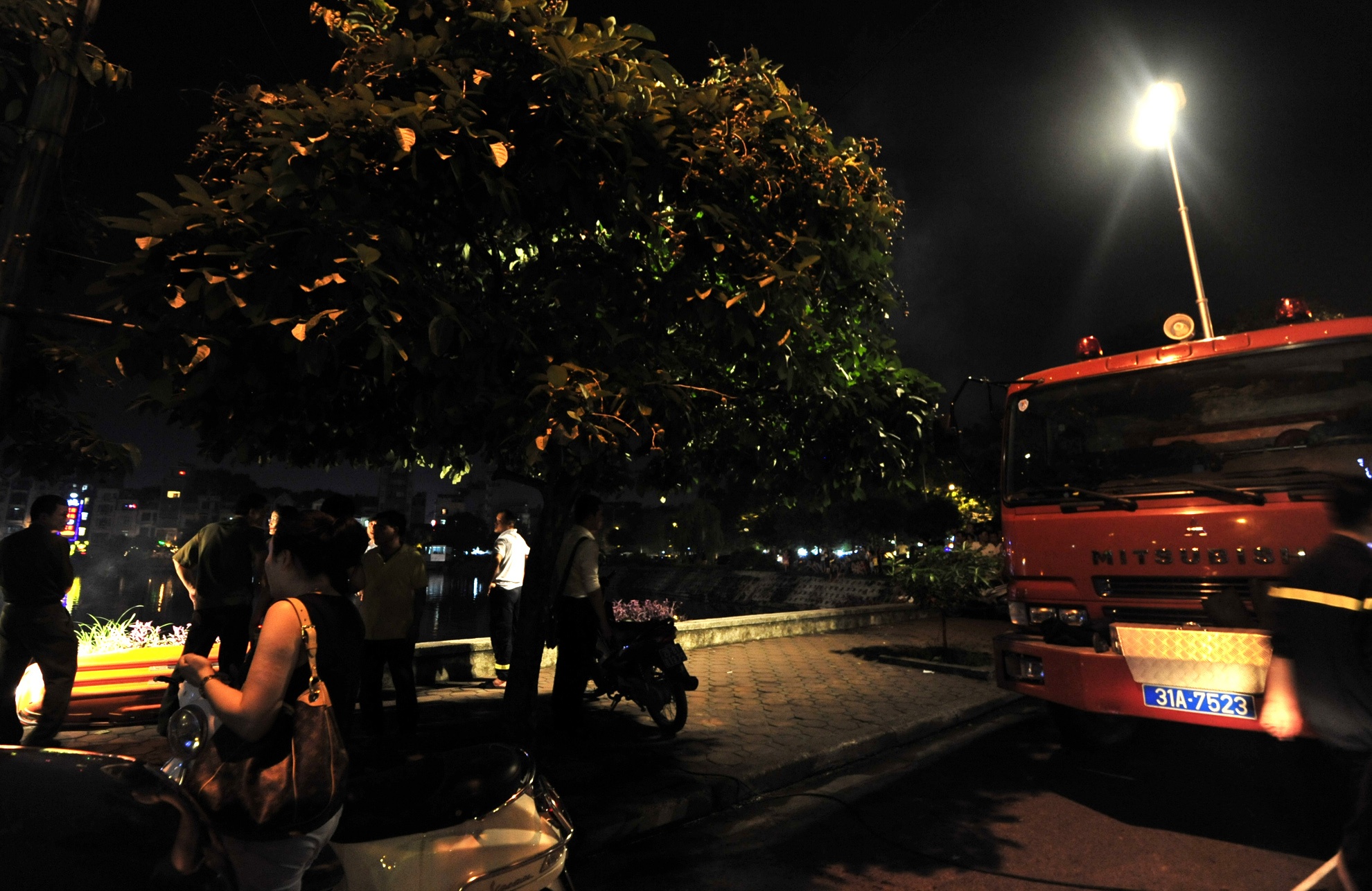| Hai xe cứu hỏa có đèn cao áp được điều động và chiếu sáng rực lòng hồ. |