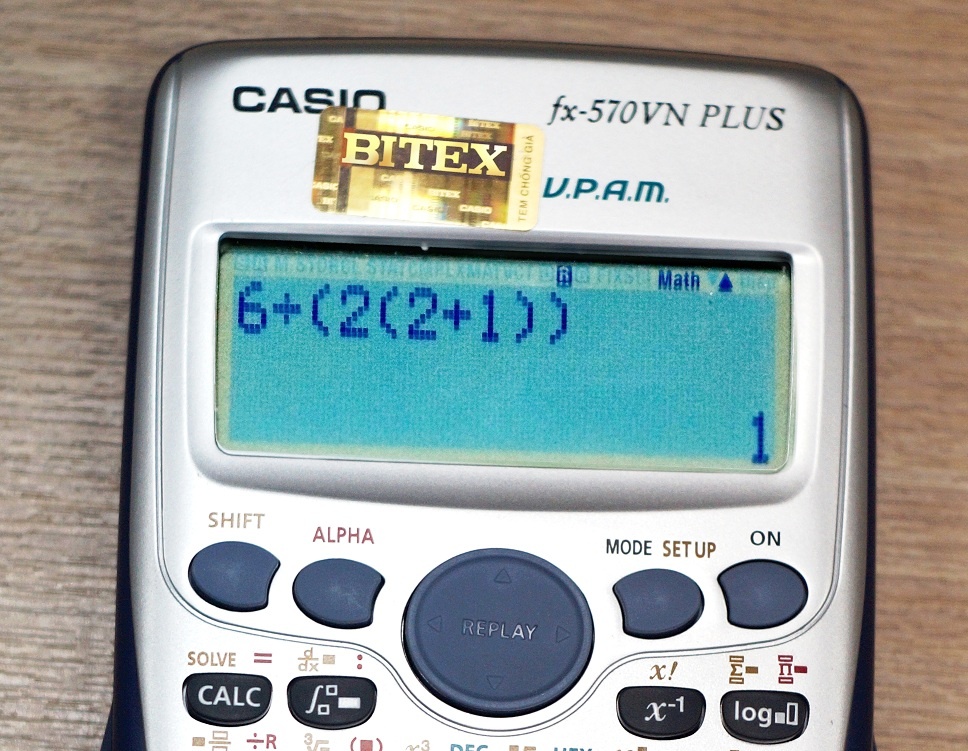 Với 2 hướng giải như trên, bài toán cho ra 2 kết quả hoàn toàn khác nhau, chủ yếu là việc xét cụm 2(2+1) được hiểu là 2x (2+1) hay [2x(2+1)]. Khi sử dụng máy tính Casio fx-570VN PLUS người sử dụng sẽ không còn gặp trường hợp như trên. Lý do là khi nhập vào màn hình máy tính 6/2(2+1) và ấn = thì máy tự động sửa thành 6/(2(2+1)) cho ra kết quả là 1.