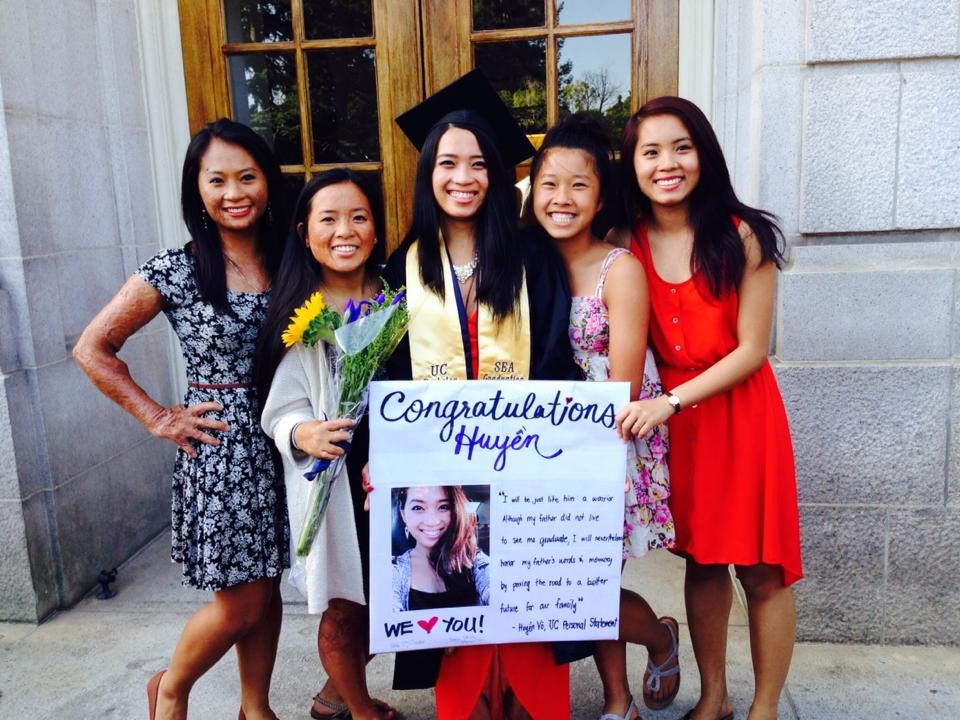 | Các chị em gái chúc mừng Huyền Kiki Võ trong ngày lễ tốt nghiệp UC Berkeley với một tấm bảng để tưởng nhớ và dành tặng niềm tự hào này cho người cha quá cố. Từ trái qua: Nhi, Lili, Huyền, Mimi và Gigi. |