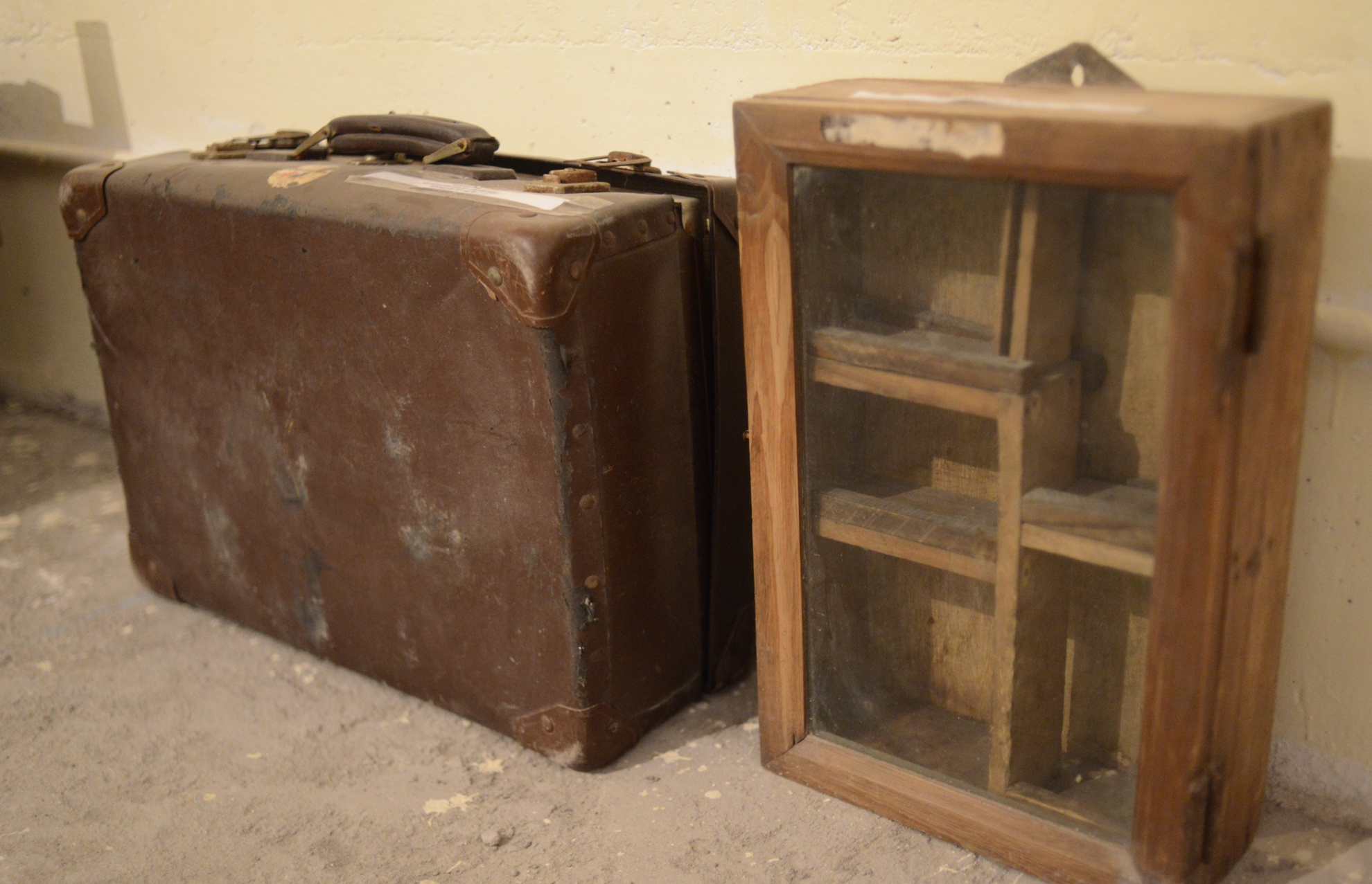 Ngay cạnh giường ngủ là vali da kéo và tủ thuốc chữa bệnh bằng gỗ.